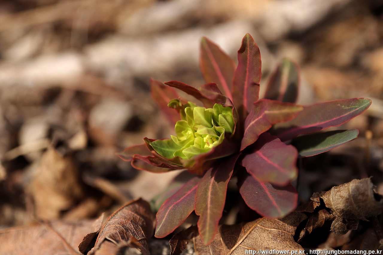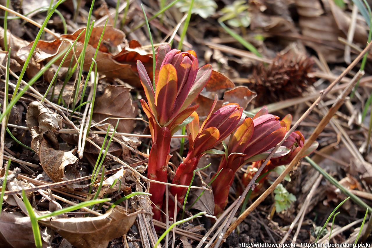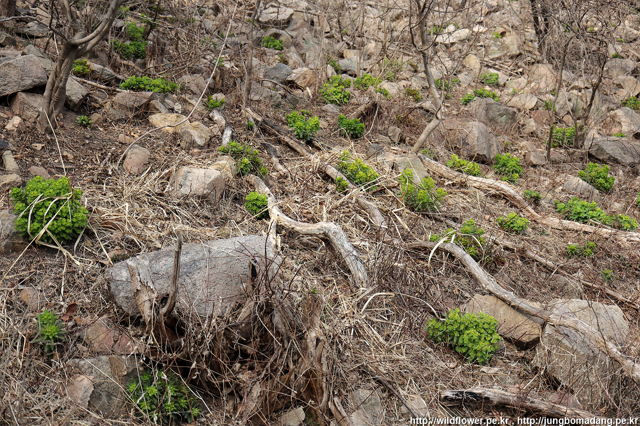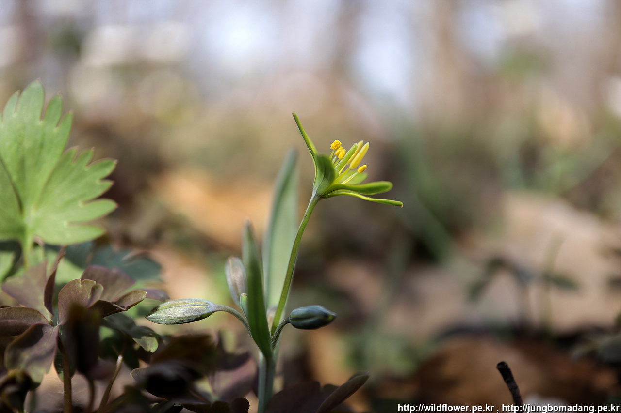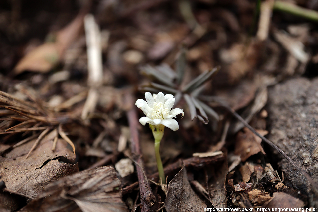 품도바람꽃 뒤에는 아직 개화하지 않은 복수초 싹이 있습니다.