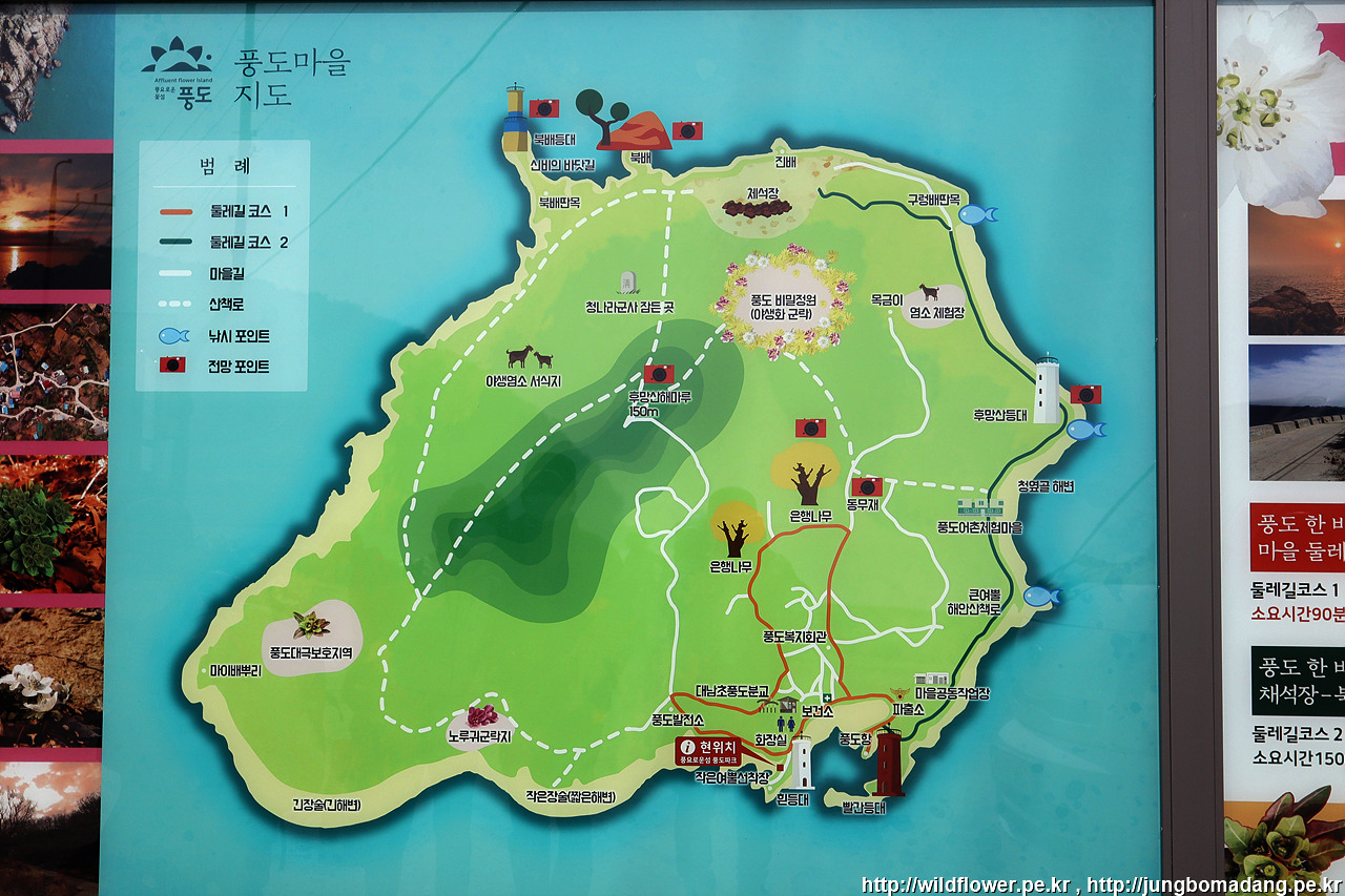 원래는 섬을 한바퀴 도는 길이 없었는 데, 새로 정비를 해서 해안로라는 이름으로 풍도를 한바퀴 걸을 수 있도록 했네요. 중간 중간 두어번 급경사 길도 있으니 참고하시구요. 북배인 줄 알았는 데, 붉배 였군요??