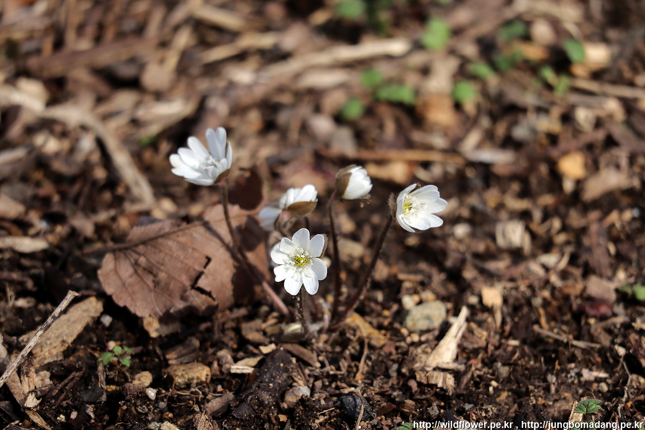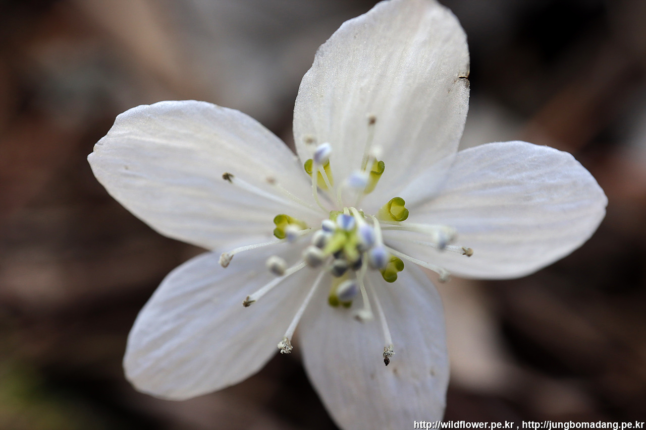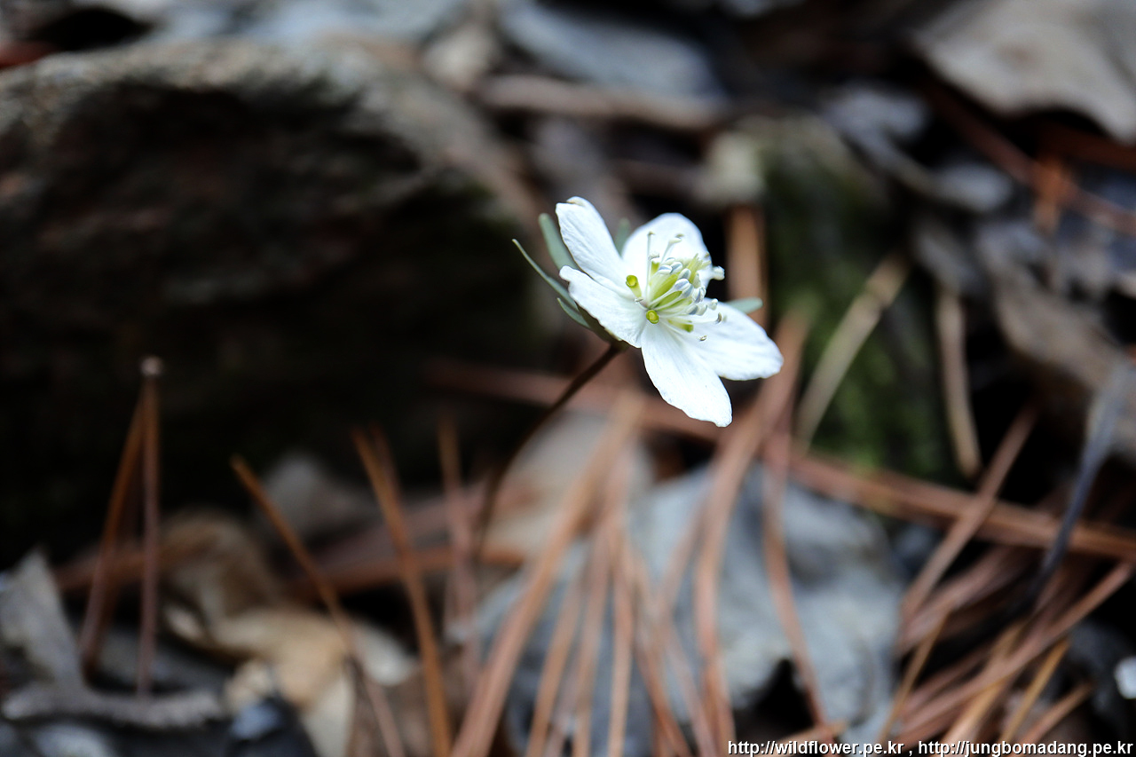 변산바람꽃 - 하얀 꽃잎 같은 5장은 꽃이 아니고 허꽃(가짜꽃)으로 곤충들을 유인하는 기능을 지녔습니다. 진짜 꽃은 가운데 연두색 깔대기 모양입니다.
