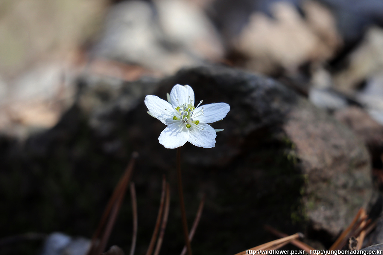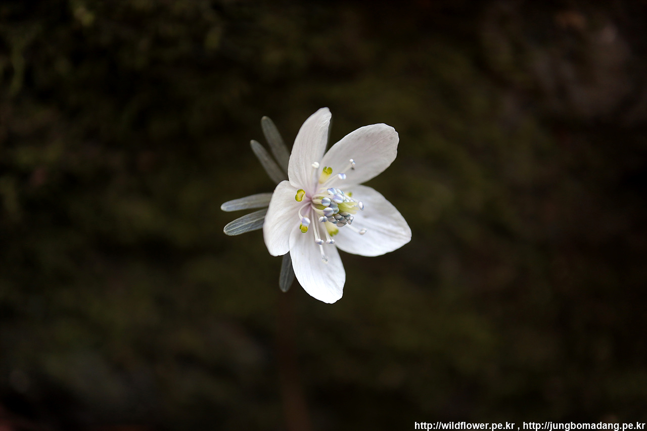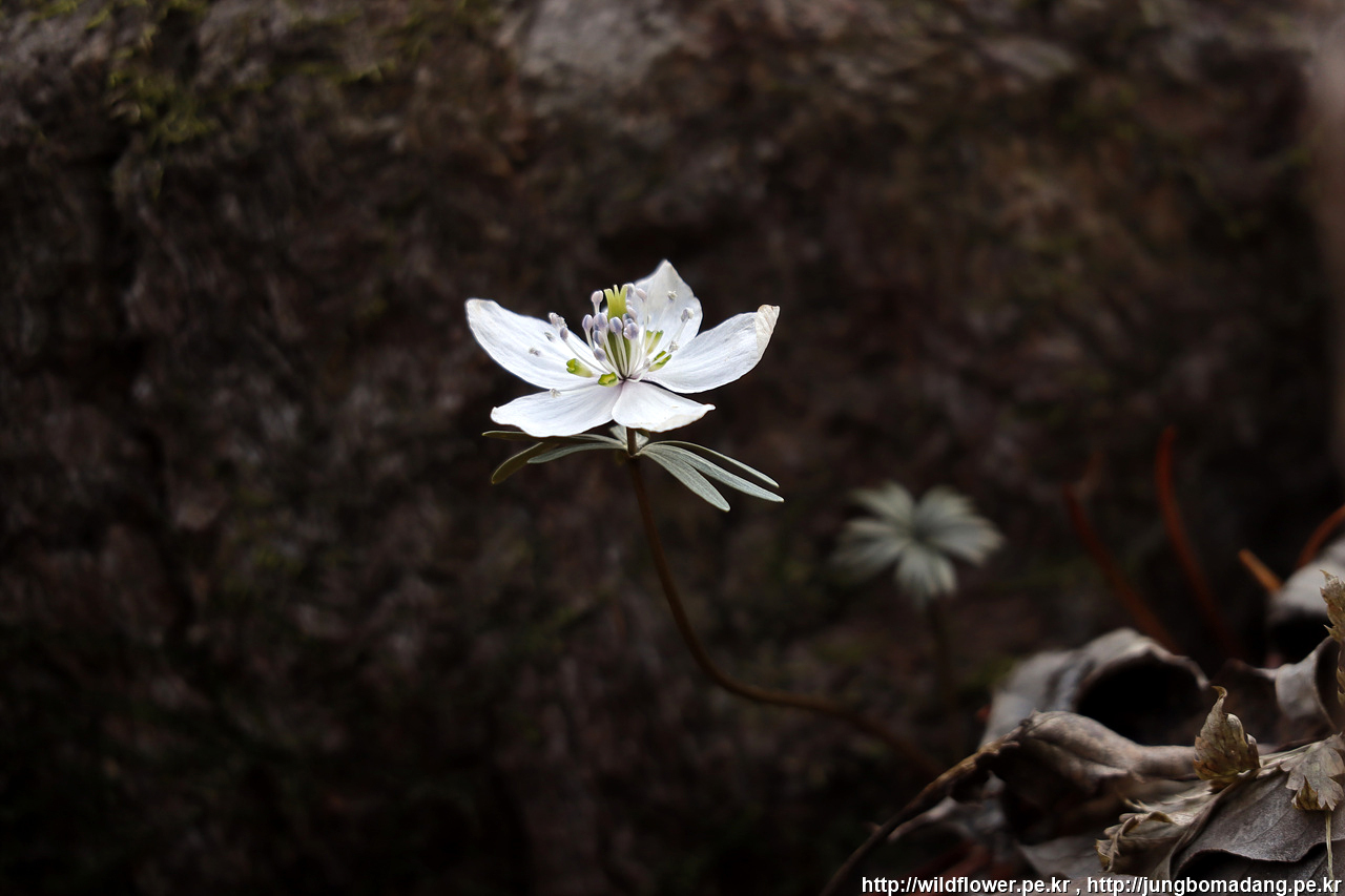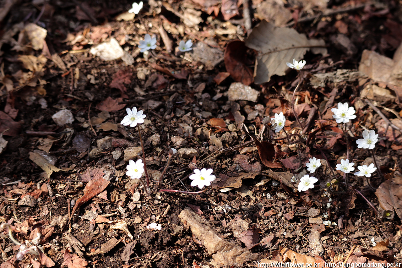 변산바람꽃 - 하얀 꽃잎 같은 5장은 꽃이 아니고 허꽃(가짜꽃)으로 곤충들을 유인하는 기능을 지녔습니다. 진짜 꽃은 가운데 연두색 깔대기 모양입니다.