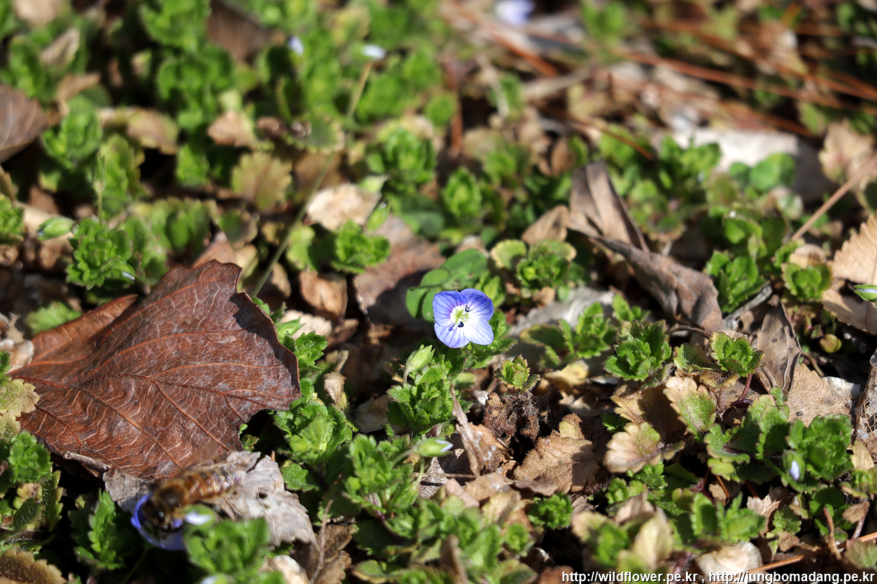봄까치꽃 - 다른 이름으로 큰개불알풀이라고 하는 데, 이는 열매가 개의 불알 모양 같다고 붙은 이름입니다. 꽃말은 기쁜소식입니다. 큰개불알풀은 어감이 별로 안좋으니 봄까치꽃이라고 불러주는 게 좋겠습니다.