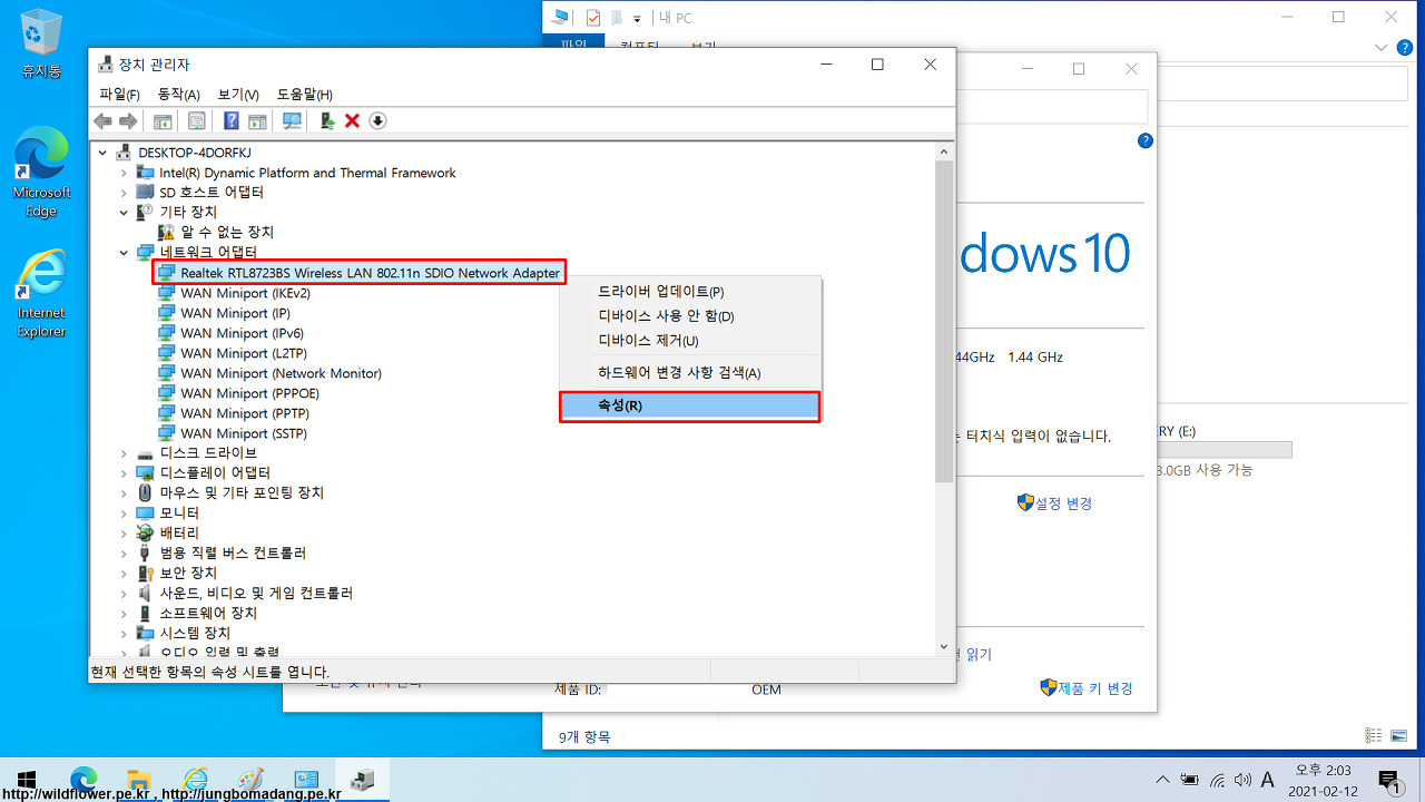 4. 장치 관리자 창에서 네트워크 어댑터 - Realtek RTL8723BS Wireless LAN 802.11n SDIO Network Adapter - 속성을 클릭합니다.