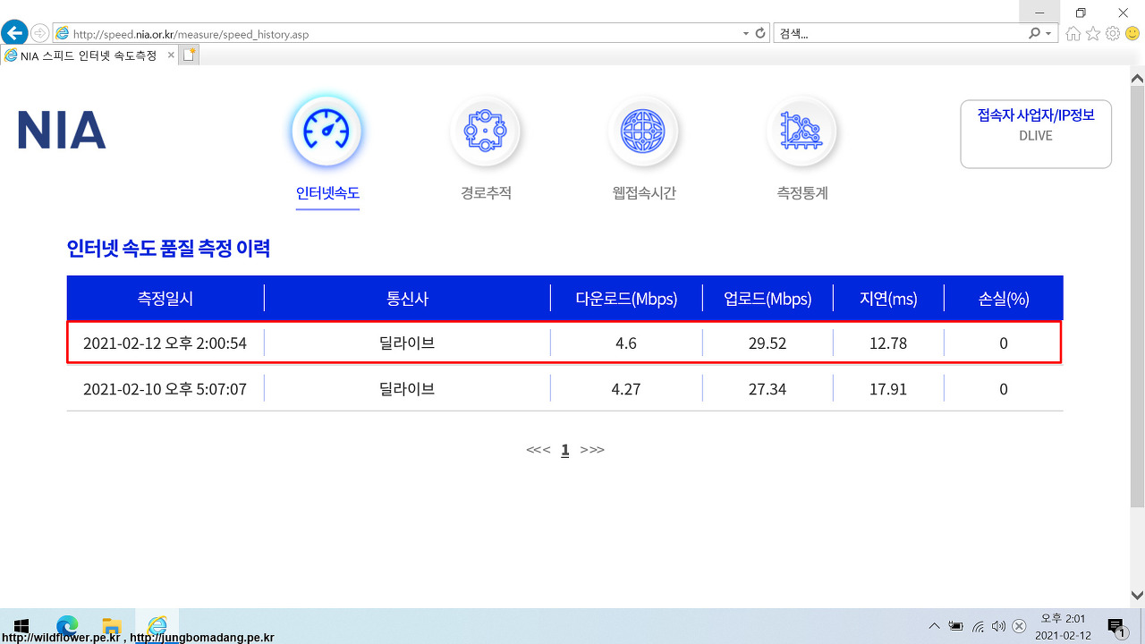 1. 딜라이브 회선 사용중인 데, http://speed.nia.or.kr/CheckAgent.asp?mode=speed 에서 인터넷속도 측정하니, 업로드는 대략 30Mbps가 나오는 데, 다운로드가 아래와 같이 5Mbps가 채 안나옵니다.