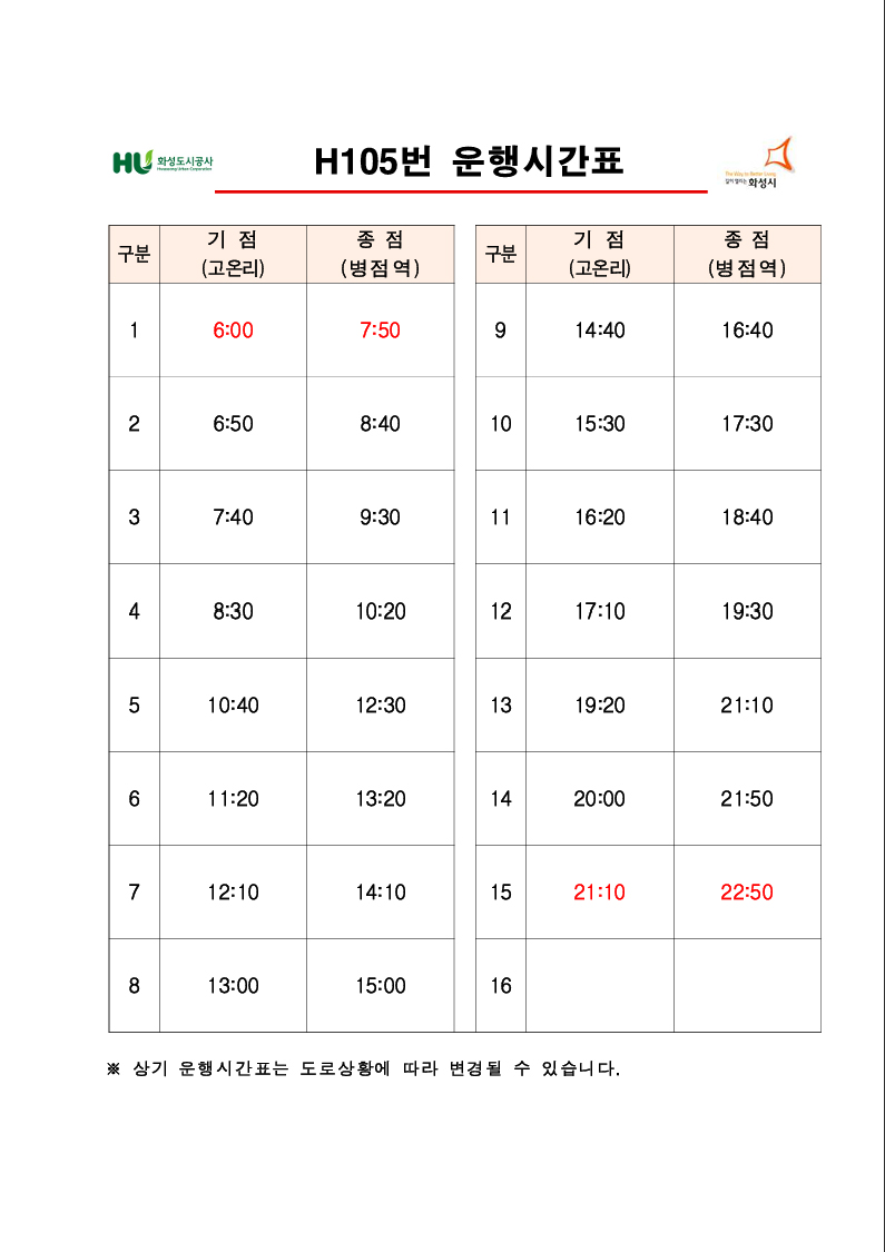 목적지로 가려면 병점역에서 H105 버스를 타고 가면됩니다. 단, 2025년 9월 1일 부로 버스 노선이 변경으로 인해 2025년 9월 1일 부터는 병점역에서 H105 버스를 한번에 타고 갈 수 없습니다. 아래 시간표는 2025년 9월 1일 이전 기준 H105 버스 시간표 입니다.