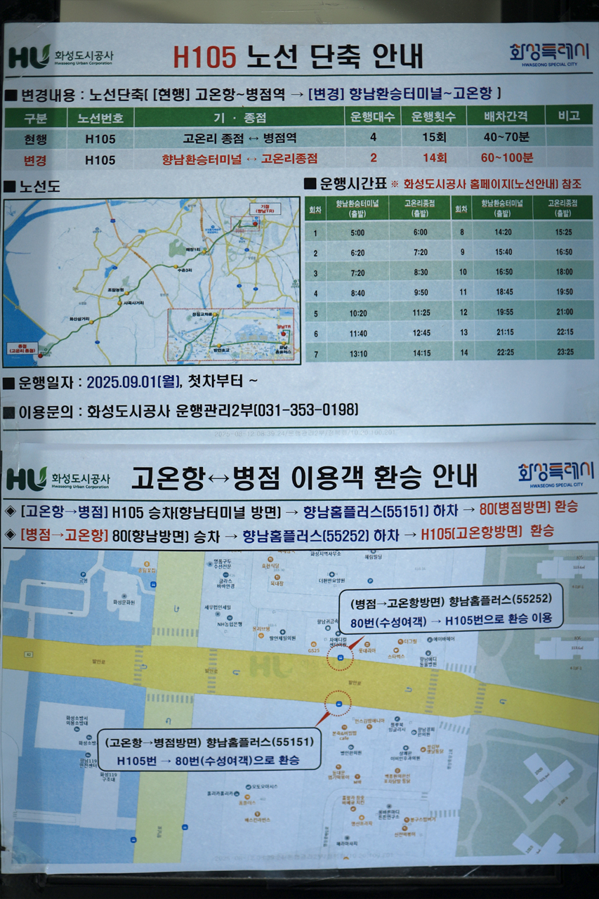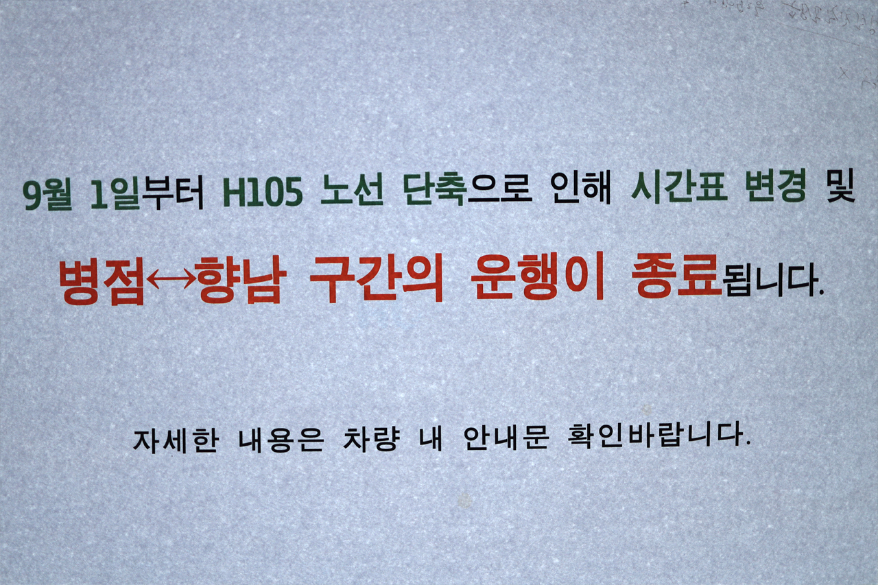 H105 버스를 타니 아래와 같은 안내문이 붙어 있습니다. 오늘이 8월 25일이니 6일이 지난 후에는 H105 버스를 한번에 이용할 수 없고 중간에 버스 환승을 해야 한다고 버스 기사님에게 문의하여 알게 되었습니다.
