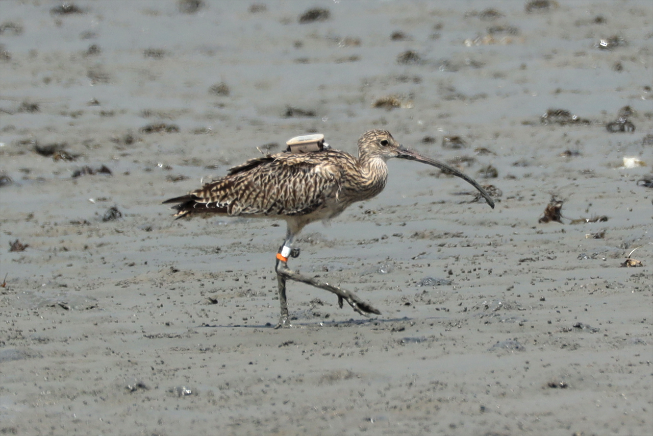 마도요 - 크롭 사진입니다. 다리에는 식별표, 등에 수신기가 부착 되어 있네요.