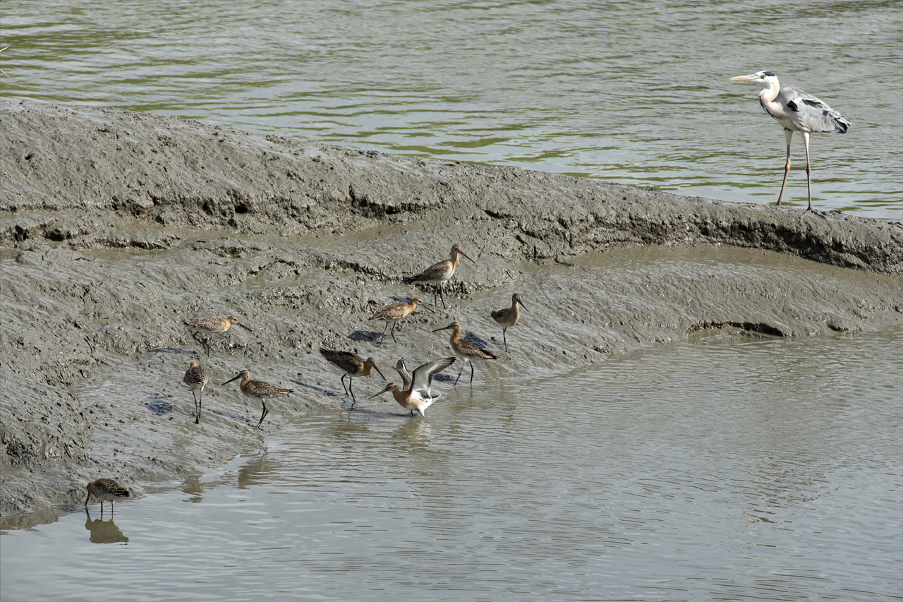 흑꼬리도요 - 크롭 사진입니다. 무리가 나타납니다. 아직 만조 시간이 지난 지 얼마 되지 않아 드러난 갯벌이 적어서 그런지 모여 있습니다. 우측에 왜가리가 혼자 지켜 보고 있네요.
