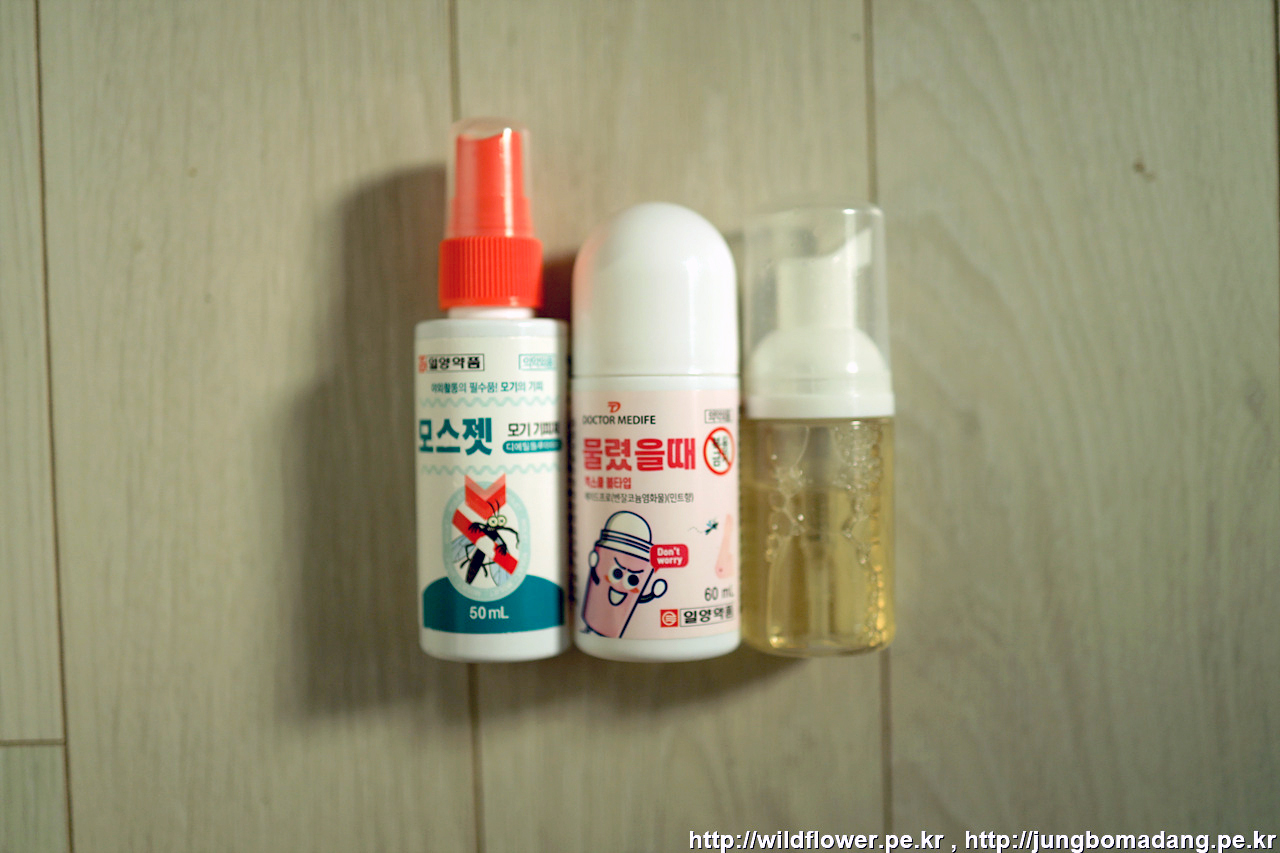 모스젯(내용물과 분사뚜껑은 오프미스트), 물렸을때(일양악품), 물비누(아이깨끗해)