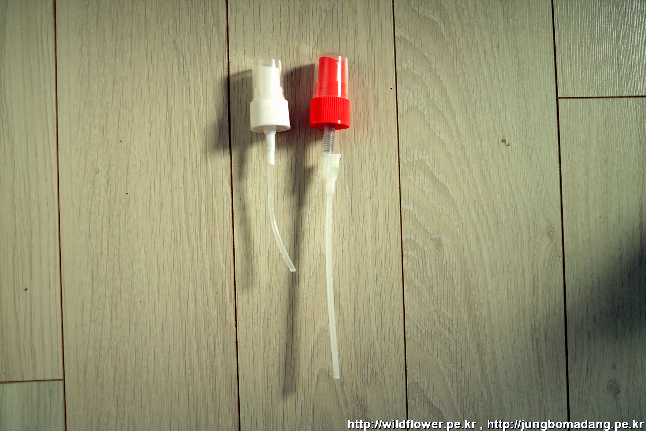 오프미스트 분사뚜껑을 모스젯 분사뚜껑 길이에 맞춰서 커터칼로 잘라내고, 끝 부분을 아래와 같이 사선으로 잘라줍니다. 그래야 끝부분에 막힘 없이 액을 흡입할 수 있겠죠?