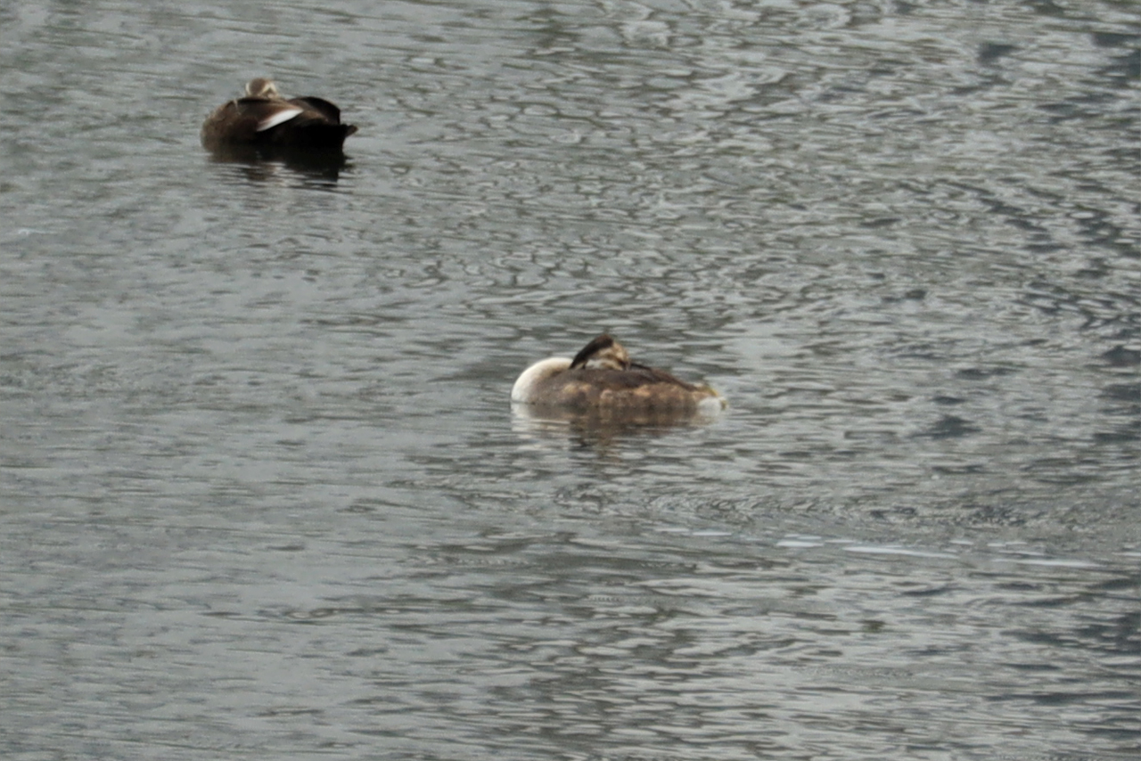 흰뺨검둥오리, 뿔논병아리 - 크롭 사진입니다. 쉬고 있네요.
