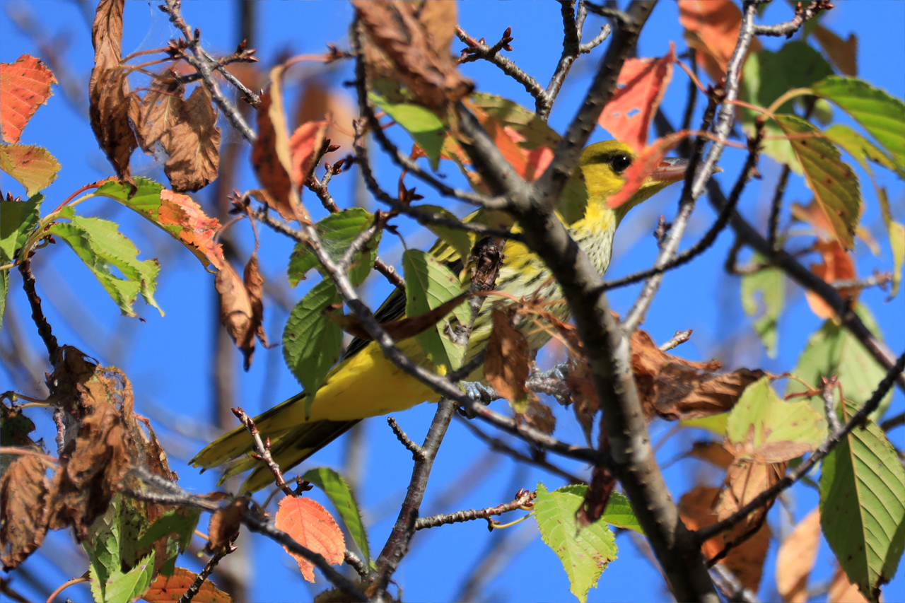 꾀꼬리 - 유조(어린새). 크롭 사진입니다. 잘 숨어 있네요.