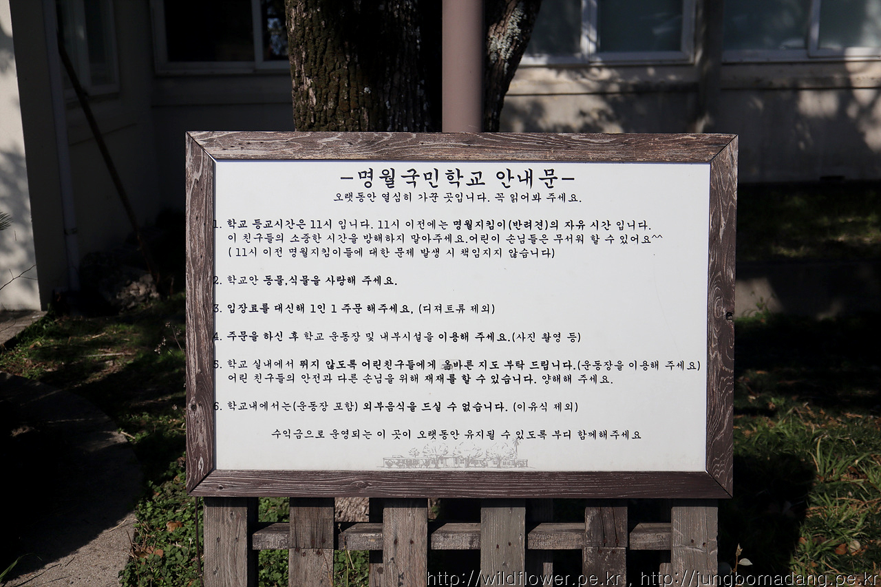 명월국민학교 안내문. 등교 시간은 11시부터라고 하네요. 어쩐지 전에 9시경 왔을 때는 정문이 닫혀 있더라구요.