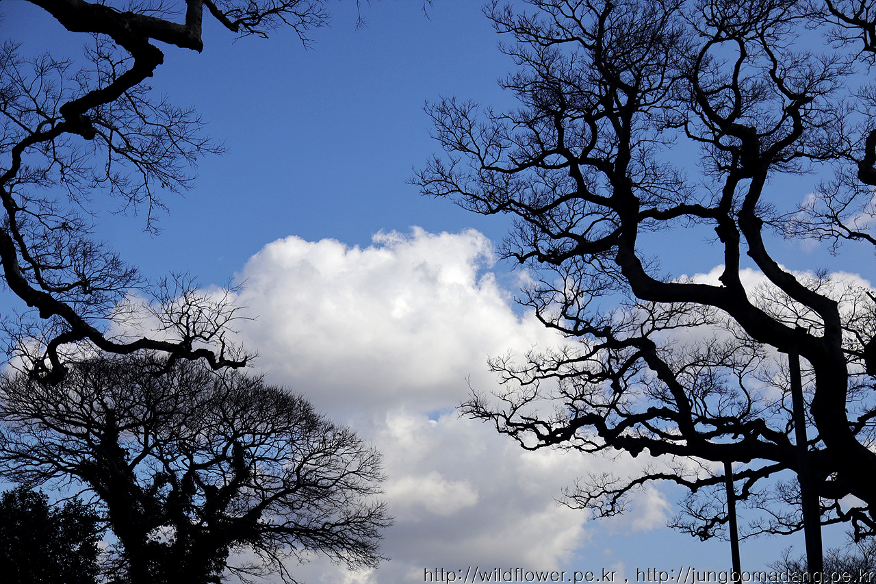 팽나무의 실루엣과 파란하늘 그리고 흰구름이 잘 어울어집니다.