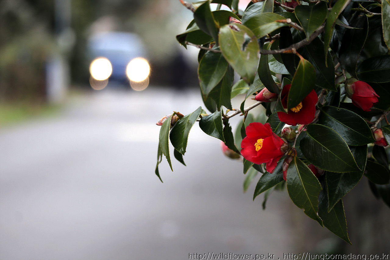담장 밖으로 삐져 나온 동백나무가 모습이 우렁찹니다.