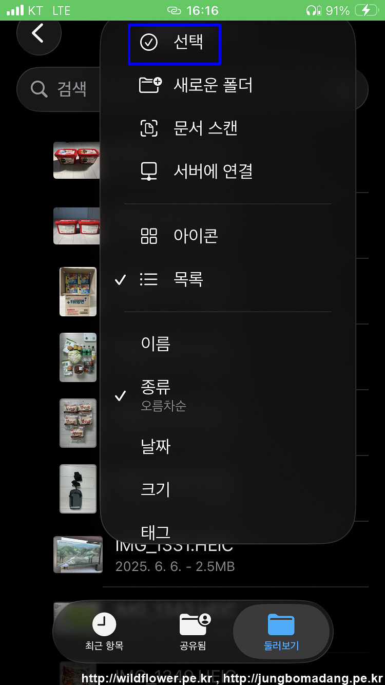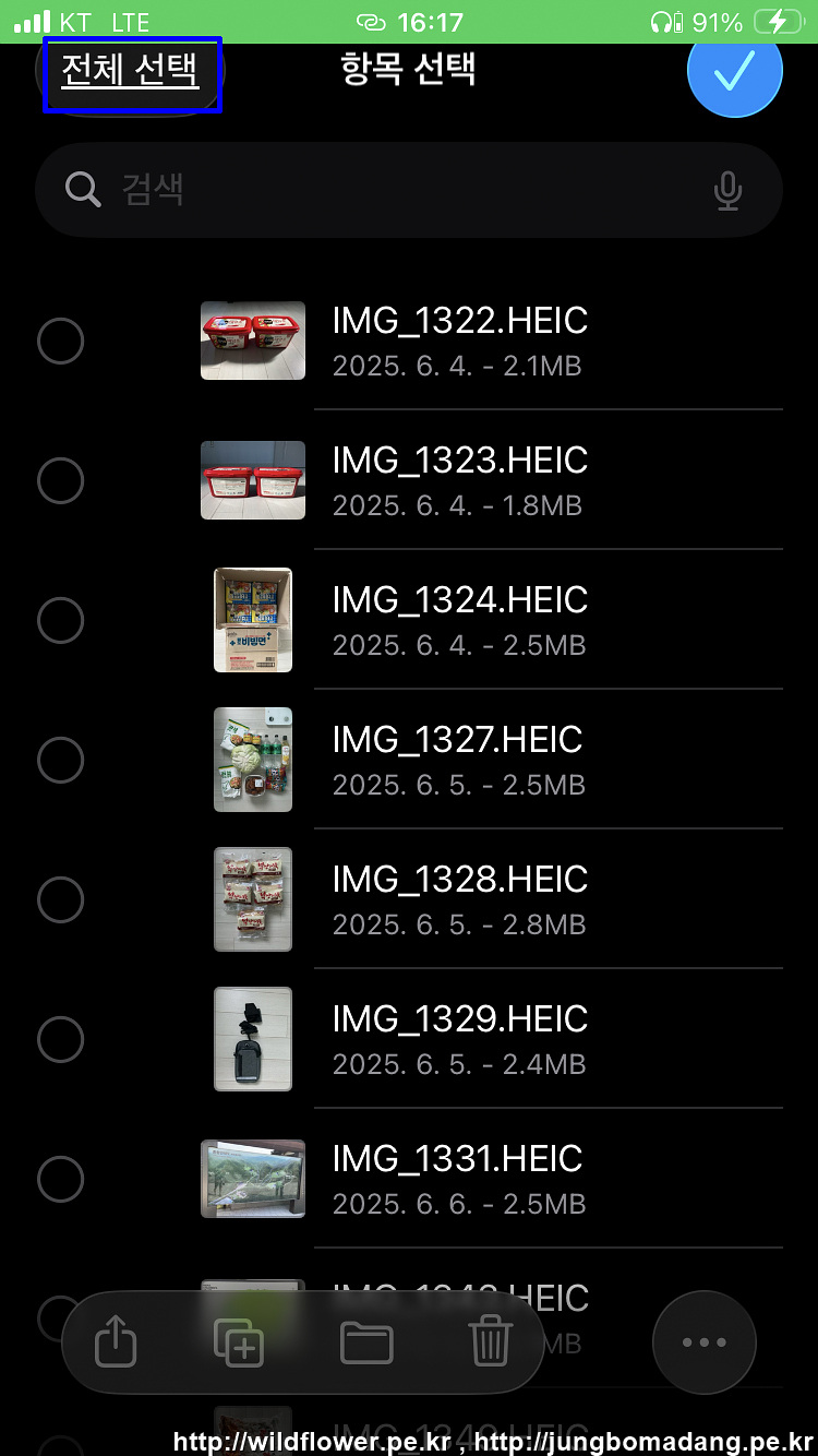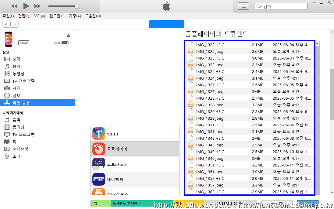 17. 아이폰의 파일 앱에서 작업 완료한 파일을 삭제합니다. 만일 즉시 삭제가 안된다면 컴퓨터의 iTune에서 곰플레이어가 아닌 다른 앱을 선택하면 삭제되는 것을 확인할 수 있습니다. 이후 필요에 따라 컴퓨터의 jpeg 파일이 변환되어 HEIC 파일이 불필요하면 삭제합니다.