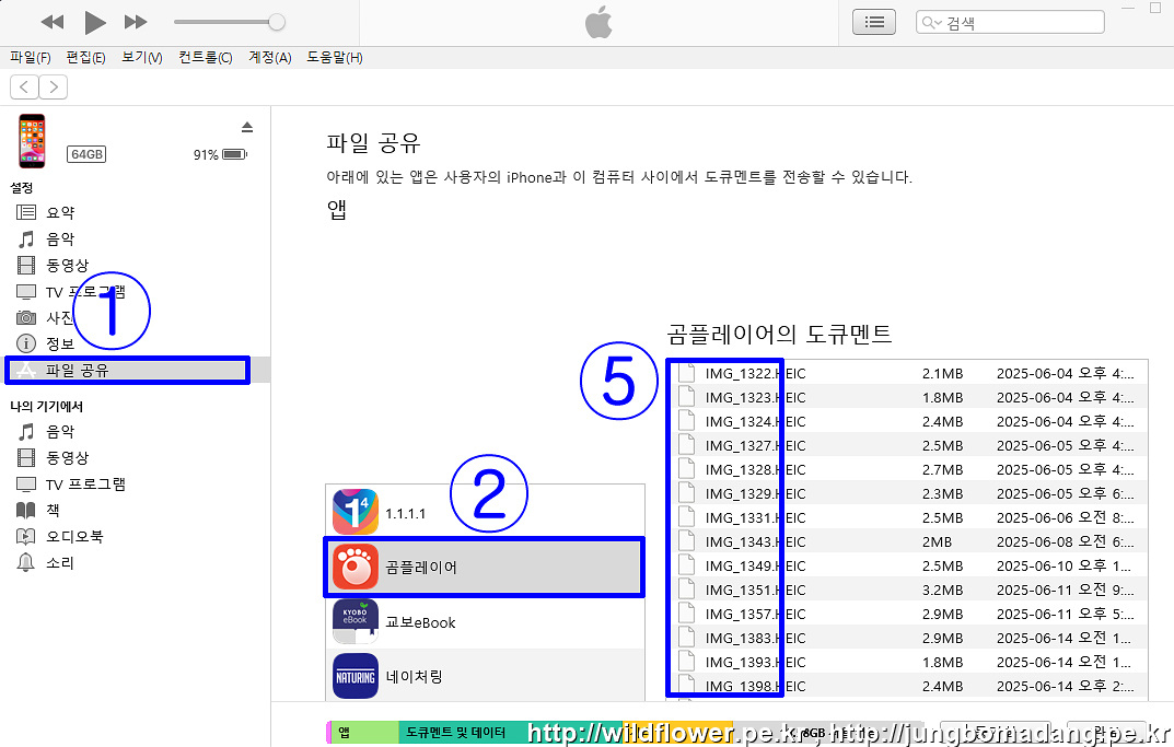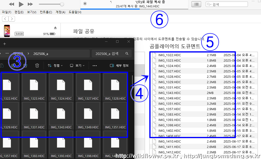 4. iTune의 파일 공유(①) - 곰플레이어(②) 를 선택 후 Windows 탐색기 창에서 복사해 둔 HEIC 파일(③)을 드래그(④)해서 iTune의 곰플레이어의 도큐멘트 영역(⑤)으로 복사를 합니다. 복사되는 과정을 iTune 상단(⑥)에서 확인가능합니다.