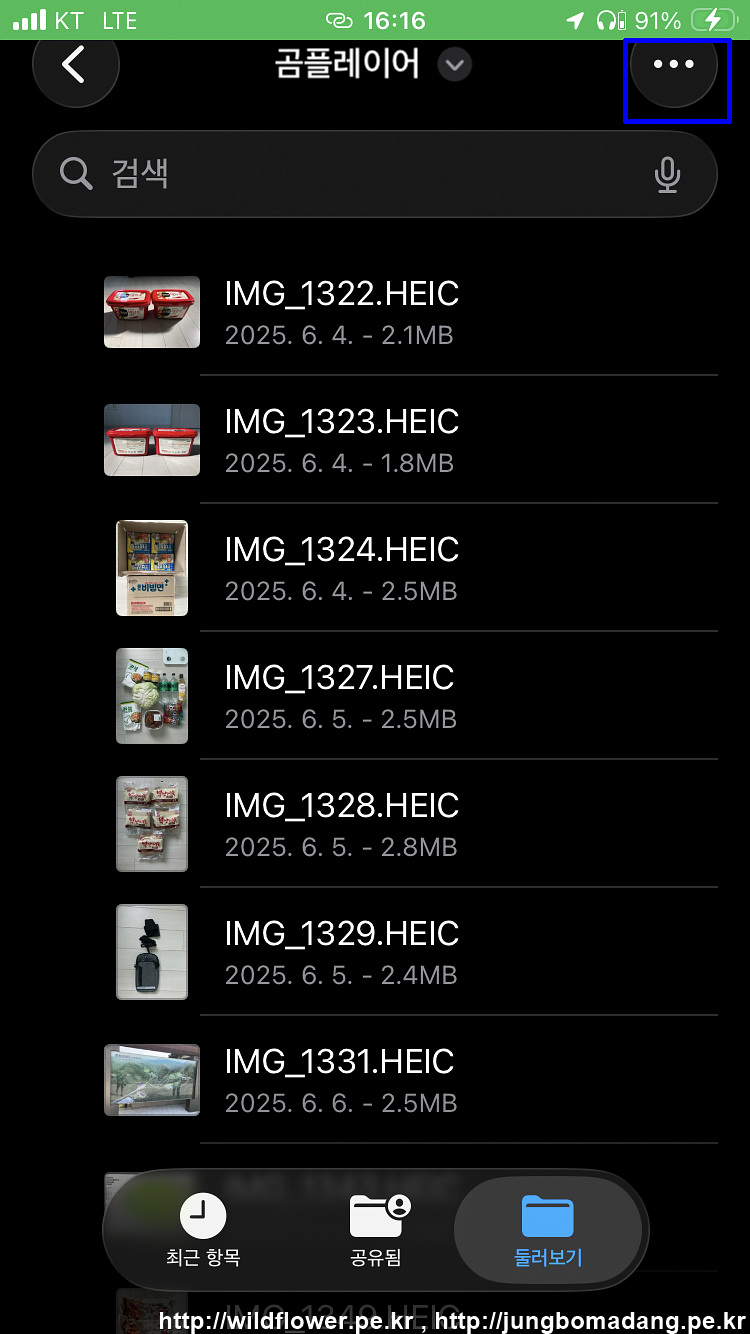 5. 아이폰 파일 앱에서 곰플레이어 폴더를 선택하면 아래와 같이 HEIC 파일이 복사된 것을 확인할 수 있습니다. 파일 갯수를 기억한 뒤, 화면 우측 상단의 · · ·를 선택합니다.