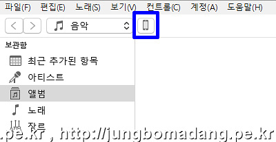3. iTune을 실행합니다. 아이폰이 정상적으로 컴퓨터에 연결이 되면 iTune 프로그램 좌측 상단에 아래와 같이 휴대폰 아이콘이 표시됩니다. 해당 아이콘을 더블 클릭합니다.