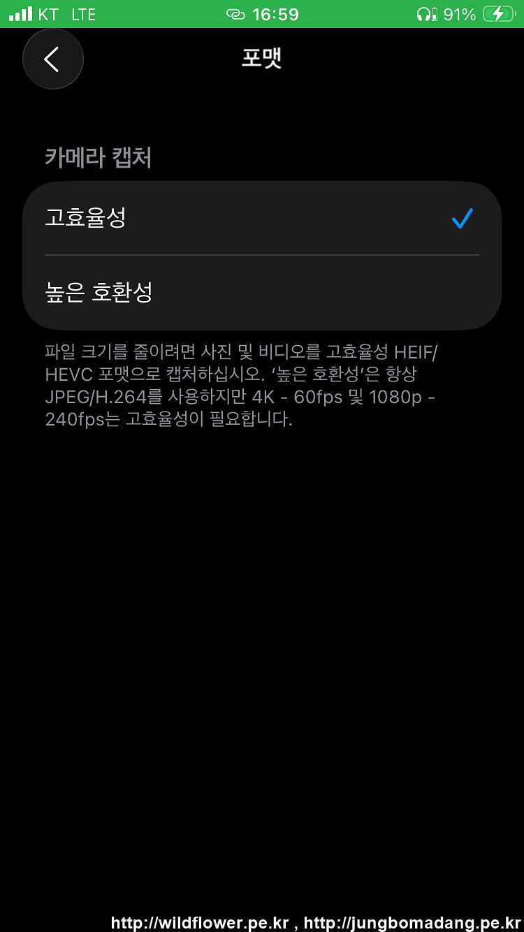 3. 기본값이 고효율성으로 설정되어 있고 고효율성인 경우 촬영 시 HEIC 파일로 이미지 저장됩니다.