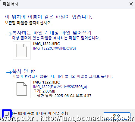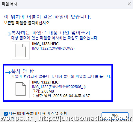 16. 복사 안 함을 선택하여 아이폰의 HEIC 파일은 제외하고 변환 된 jpeg 파일만 컴퓨터로 복사합니다.