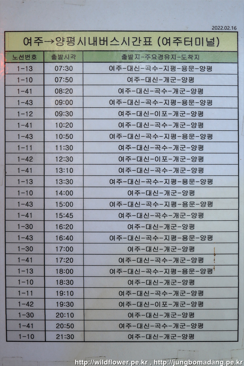 여주 터미널에 붙어 있는 여주에서 출발하는 여주발 양평행 시내버스 시간표입니다.