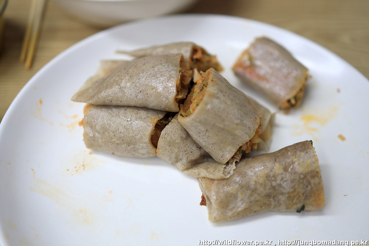메밀전병 4개, 배추지짐 2개 그리고 좁쌀동동주 1병 주문