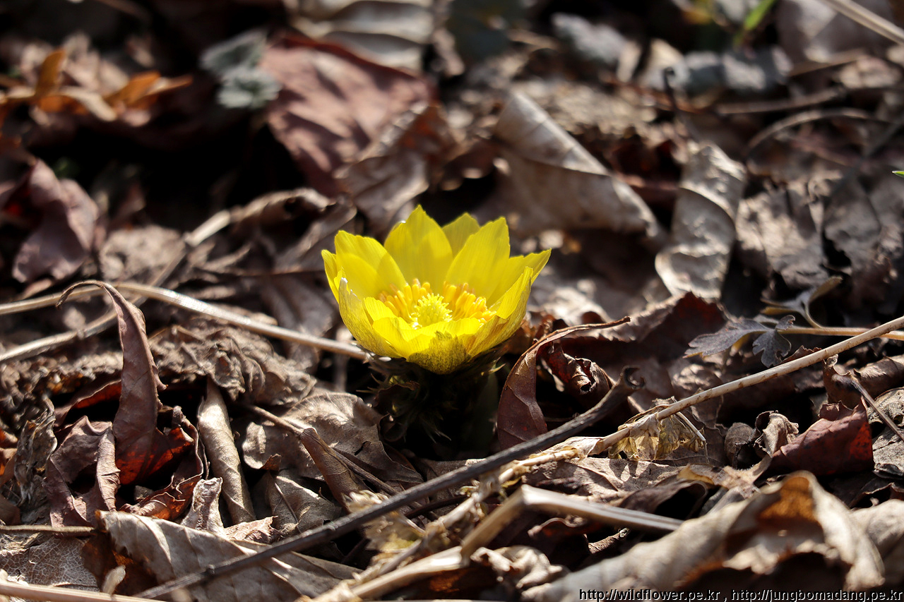 버스를 타고 한라생태숲에 왔는 데, 세복수초만 피어 있습니다.