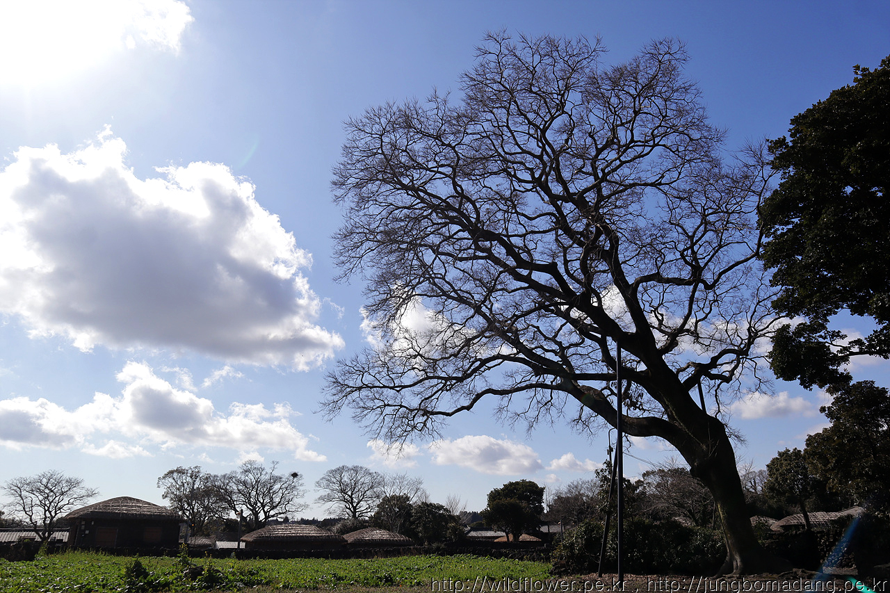 팽나무의 실루엣과 파란하늘 그리고 흰구름이 잘 어울어집니다.