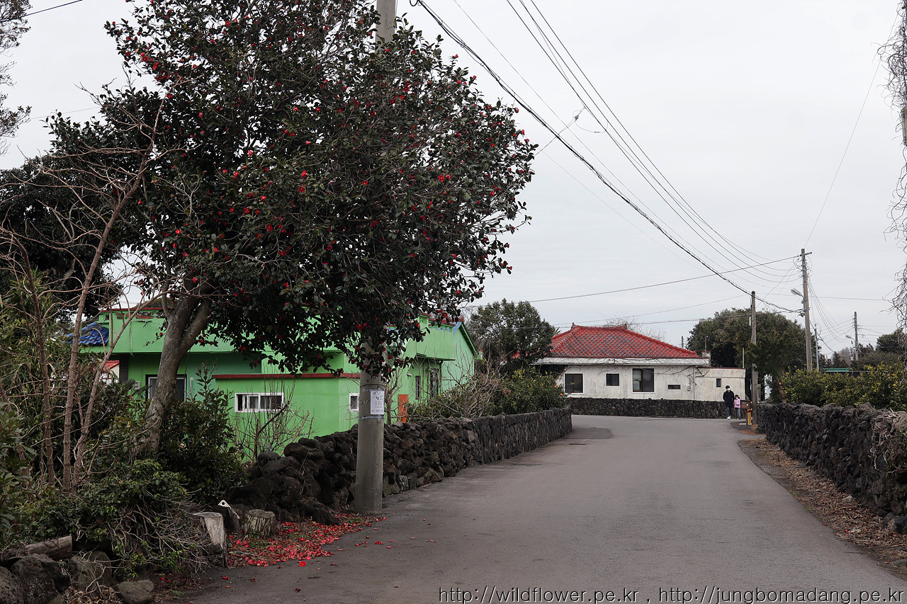 담장 밖으로 삐져 나온 동백나무가 모습이 우렁찹니다.