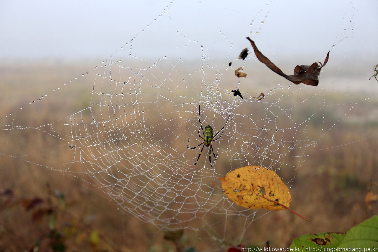 습기를 잔뜩 머금은 거미줄 가운데 무당거미 한마리. 굿은 안 한다고 전해집니다.