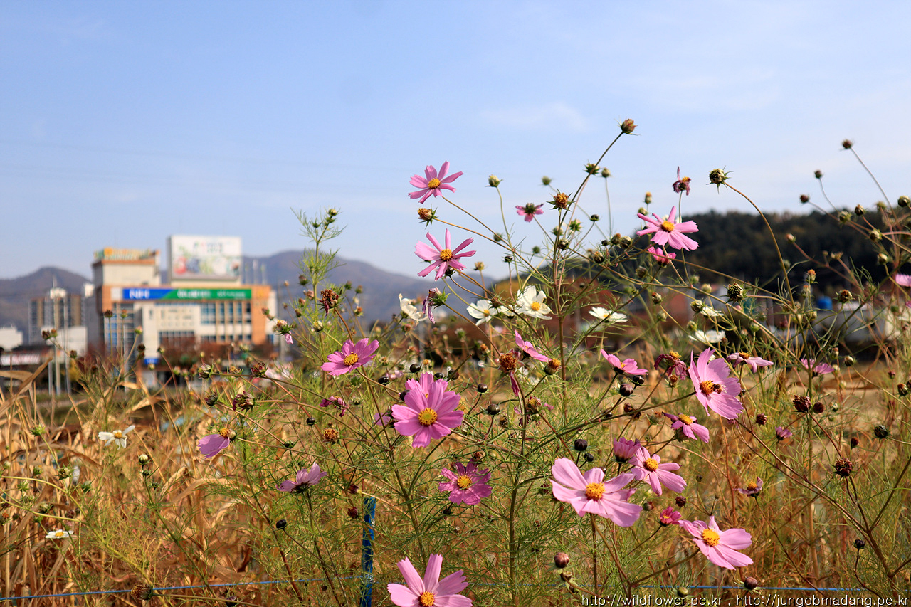 첫번째 목적지가 코스모스 뒤로 보입니다.