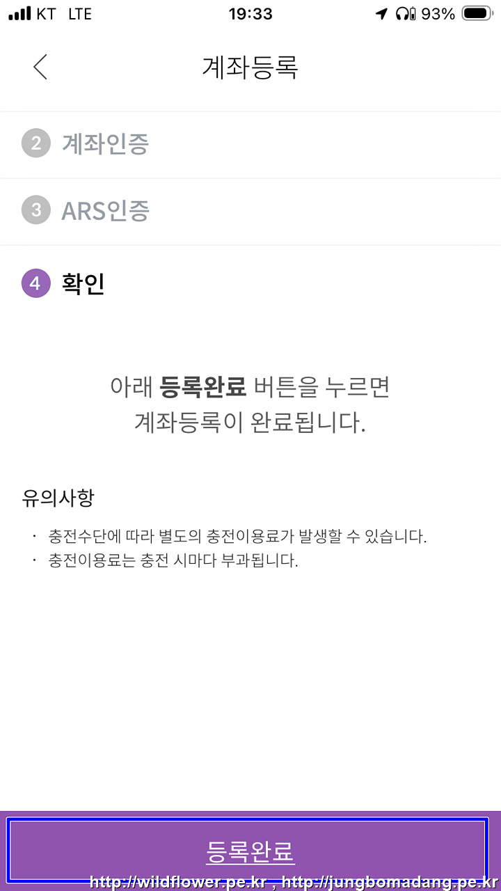 23. '등록완료'를 선택합니다. 계좌 등록 및 본인인증 과정이 끝났습니다.