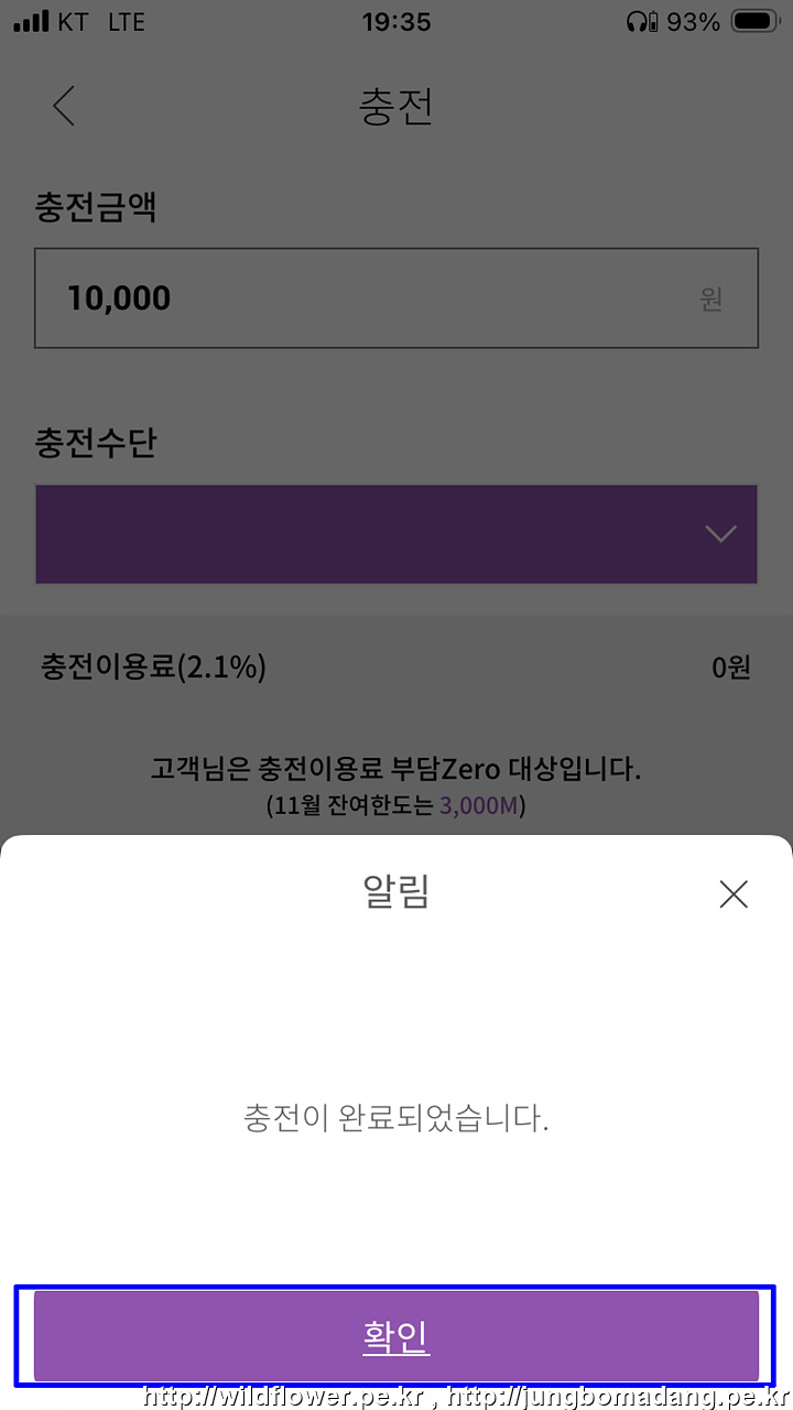 26. 충전이 완료되었습니다. 라는 안내가 나옵니다. '확인'을 선택합니다.