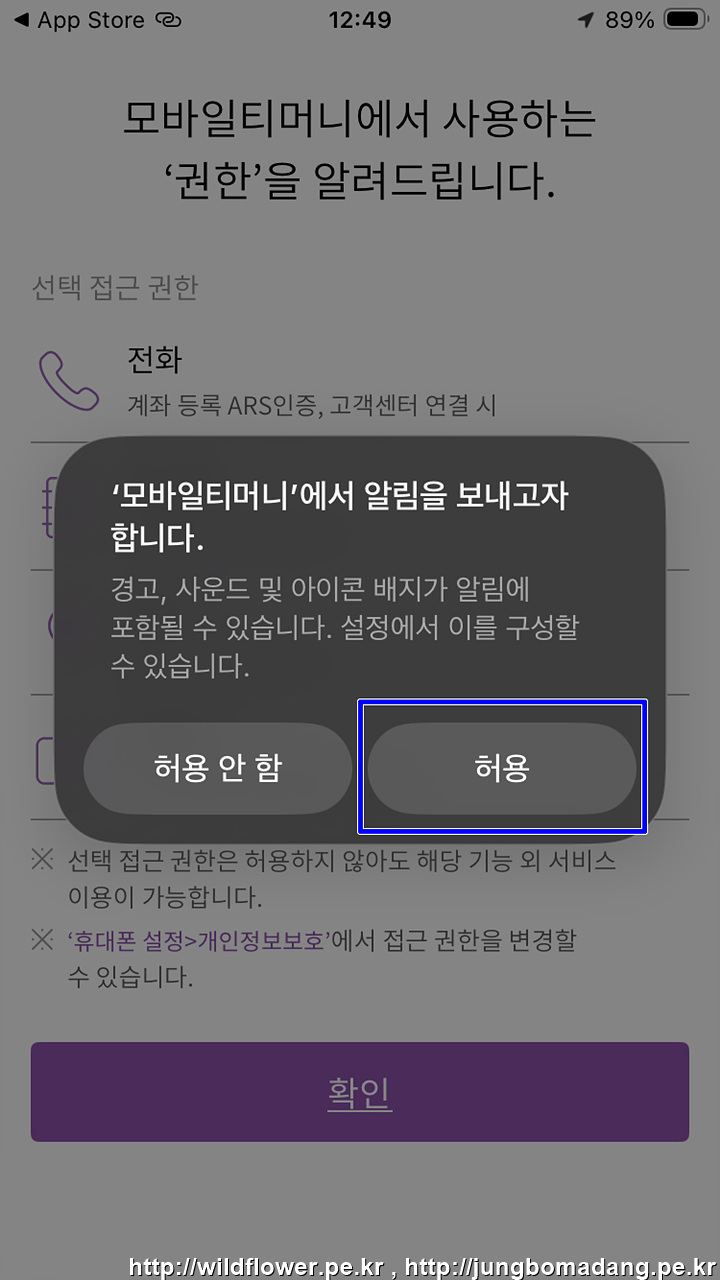 4. 모바일티머니가 사용하는 권한에 대한 안내인데 '확인'을 선택하면 됩니다.