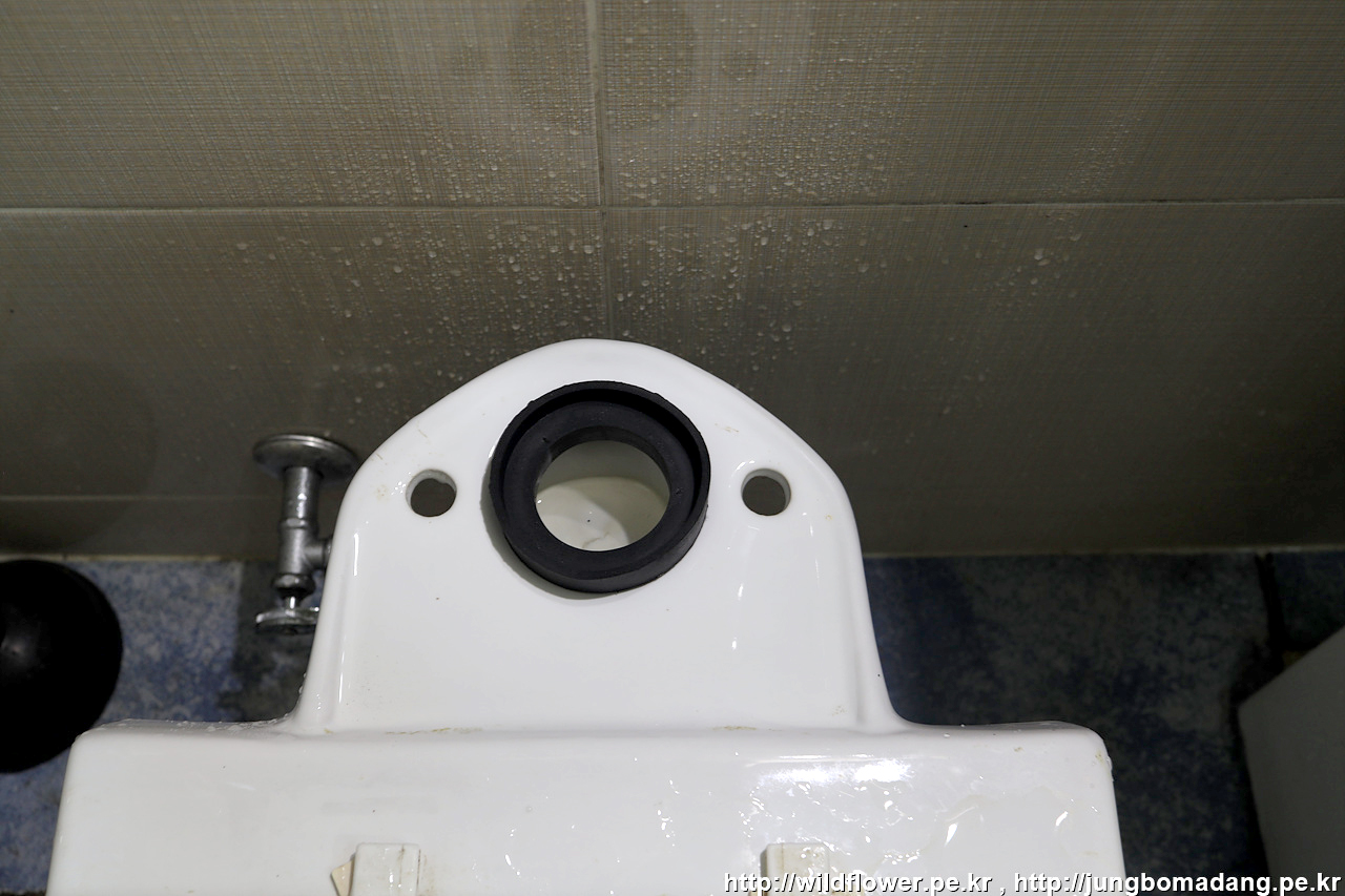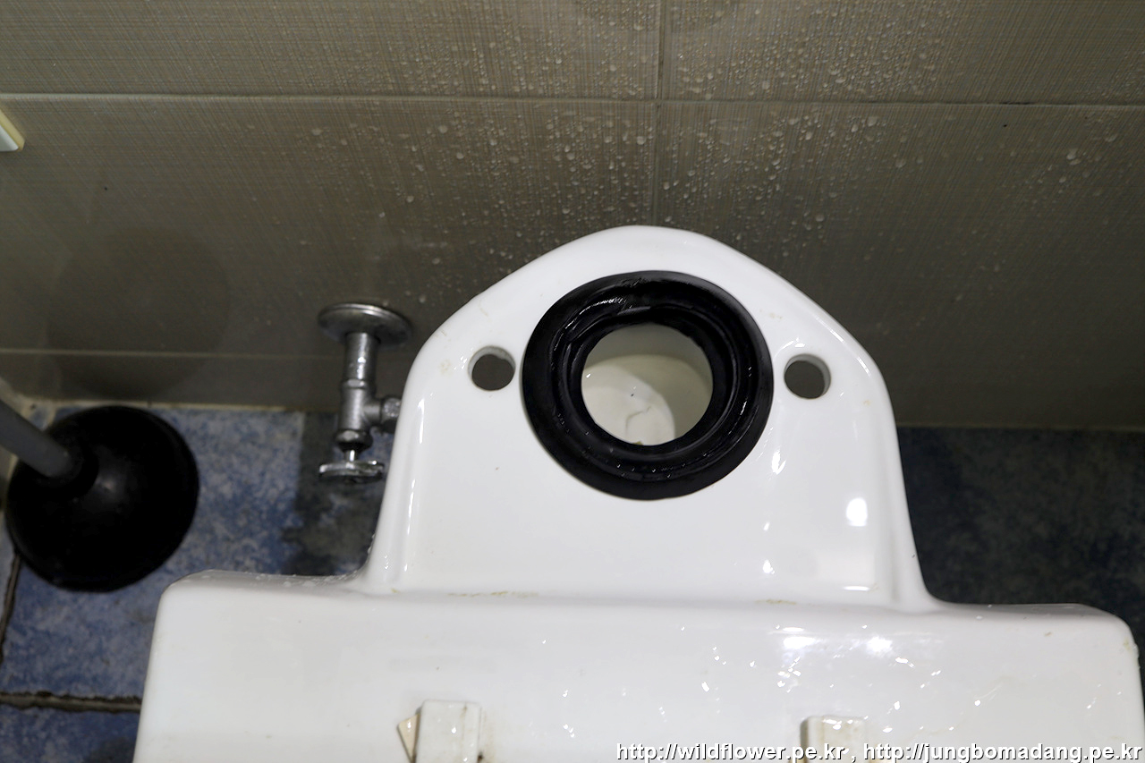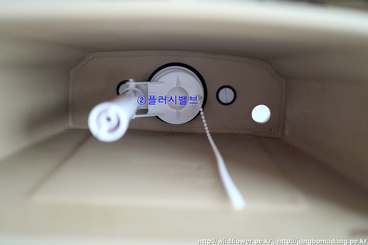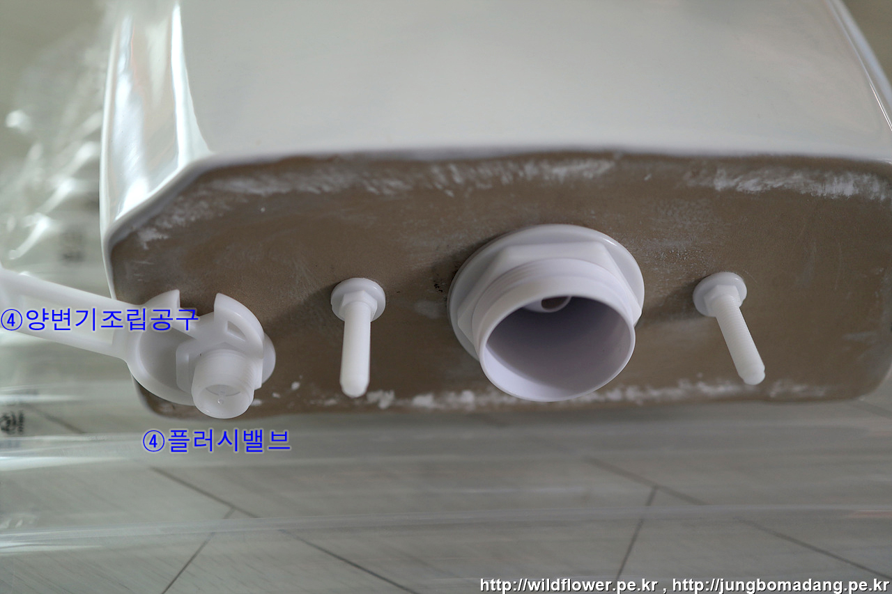 2. 플러시밸브 설치 - 물탱크 안쪽에서 구멍에 끼웁니다. 방향 주의합니다.