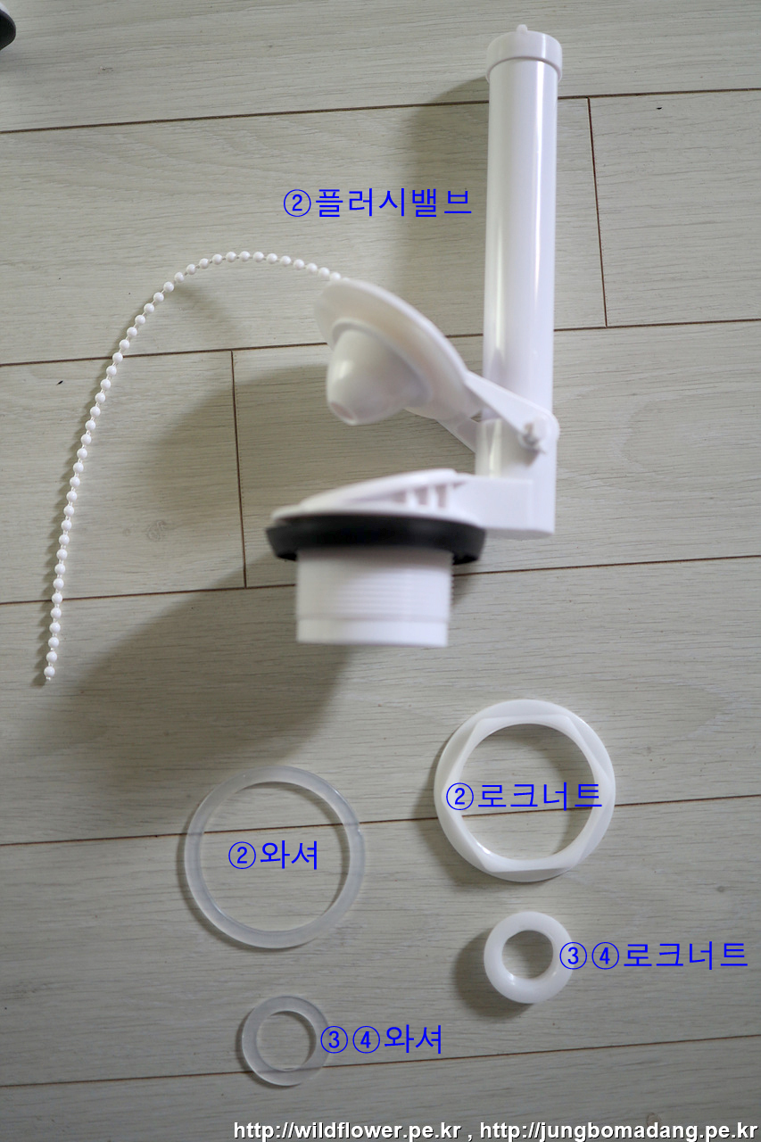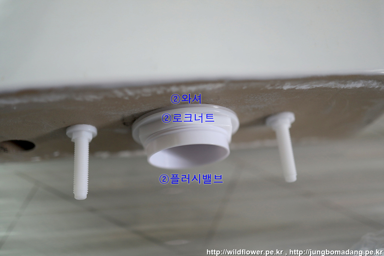2. 플러시밸브 설치 - 플러시밸브를 물탱크에 끼우고, 와셔와 로크너트로 체결합니다.