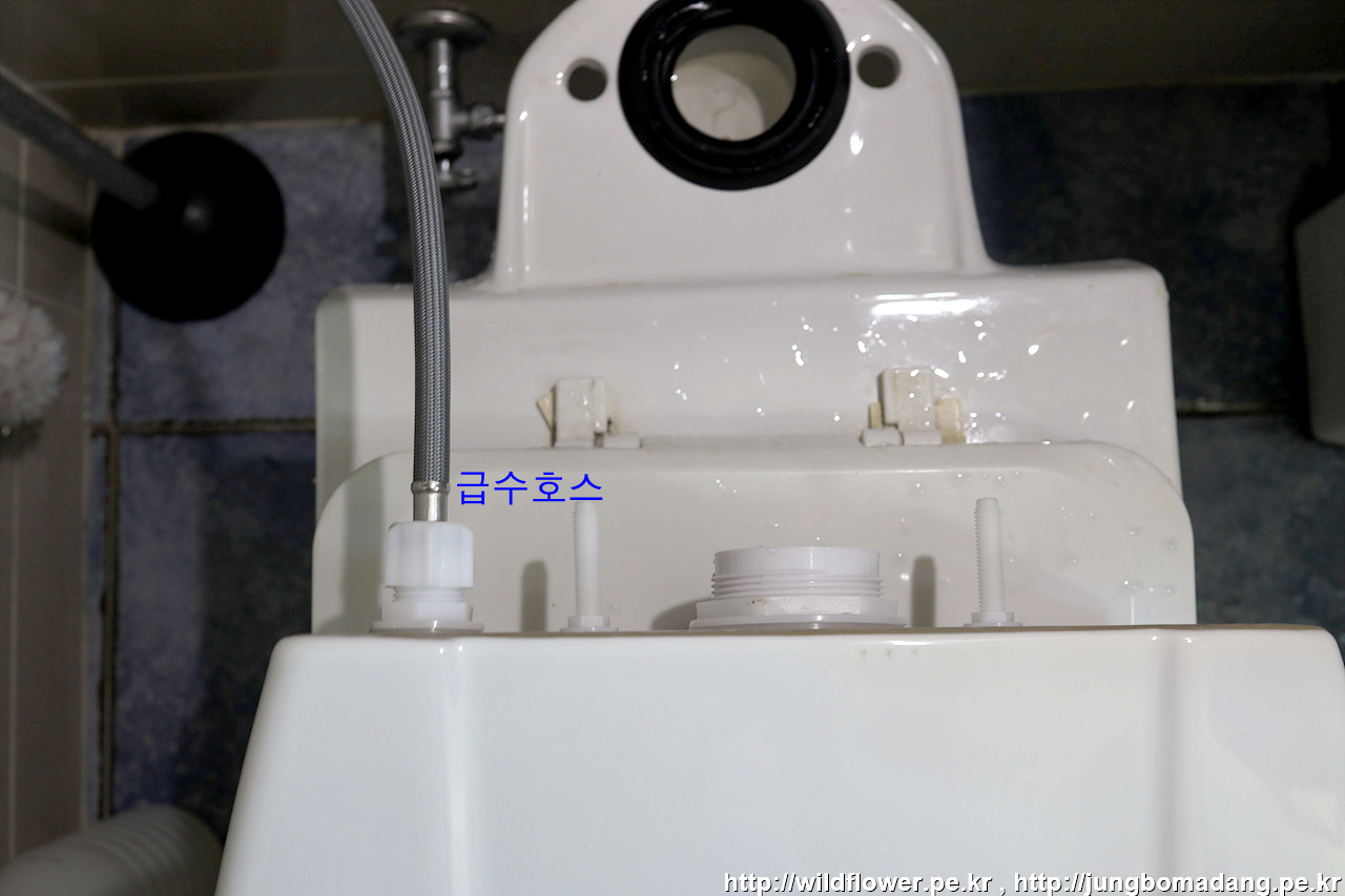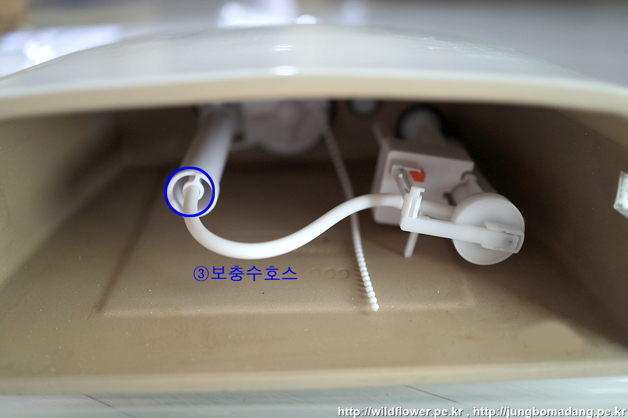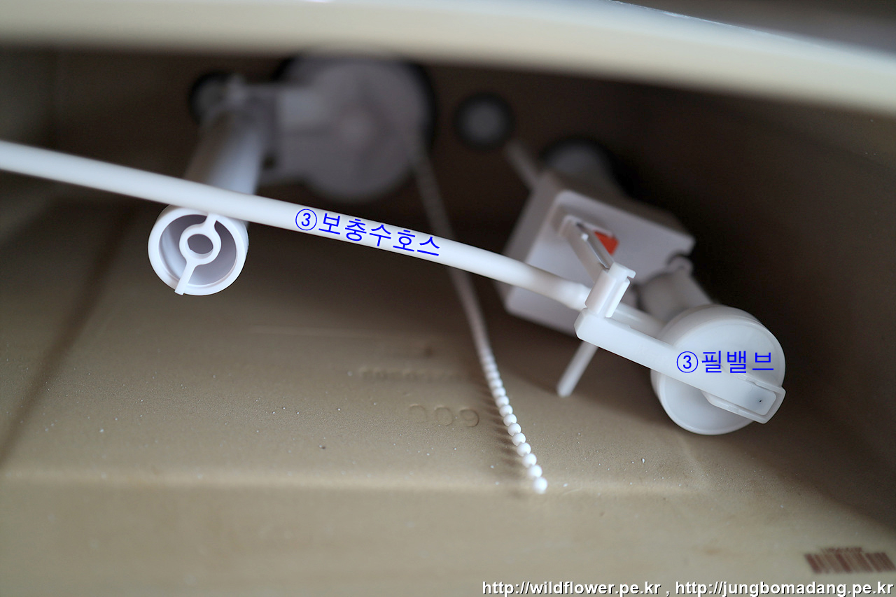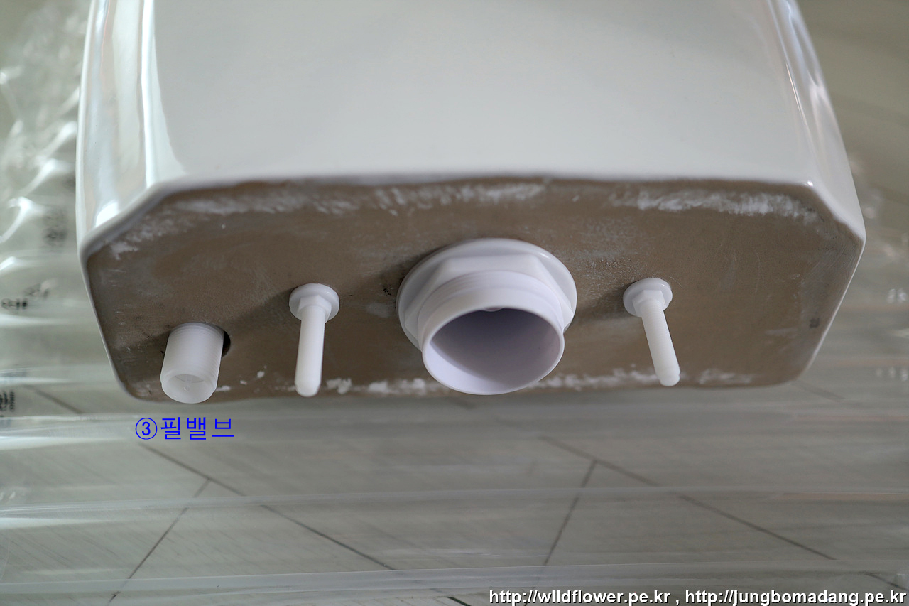 3. 필밸브 설치 - 물탱크 안쪽에서 구멍을 통해 바깥쪽으로 뺍니다. 보충수호스가 플러스밸브 방향을 보게 뺍니다.