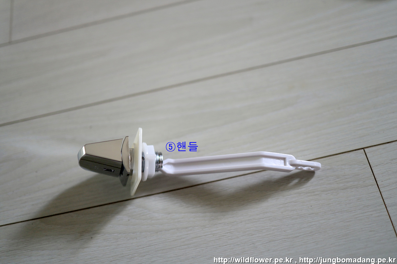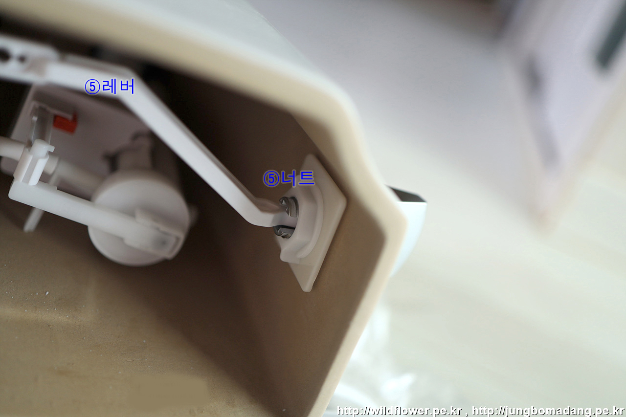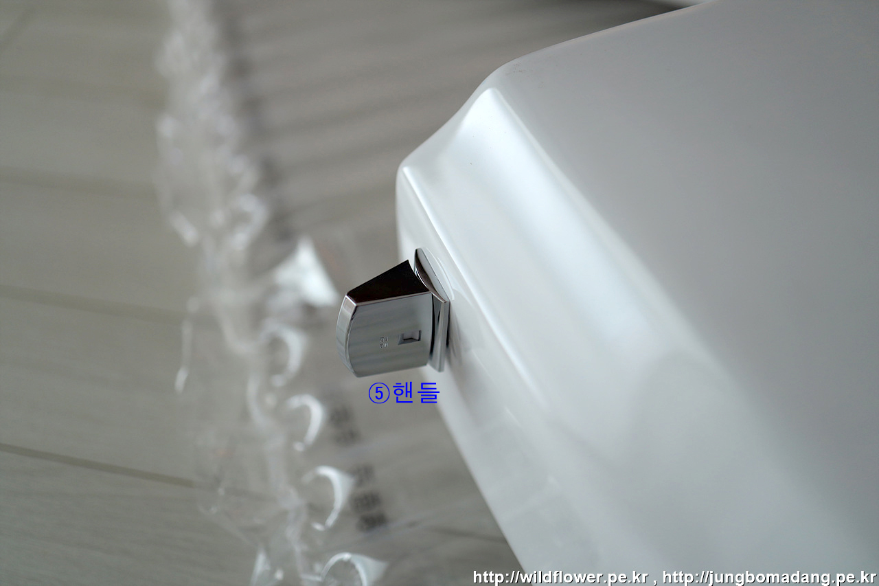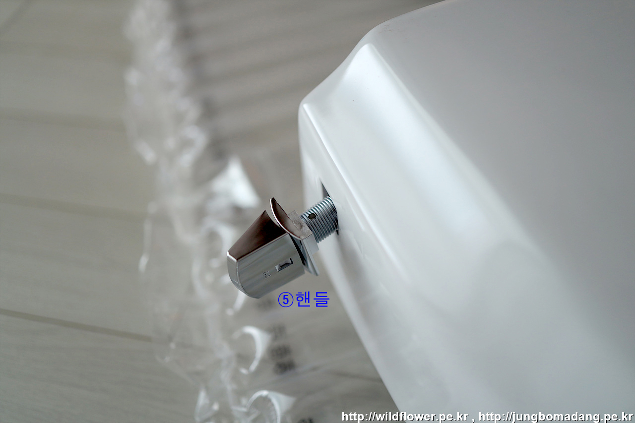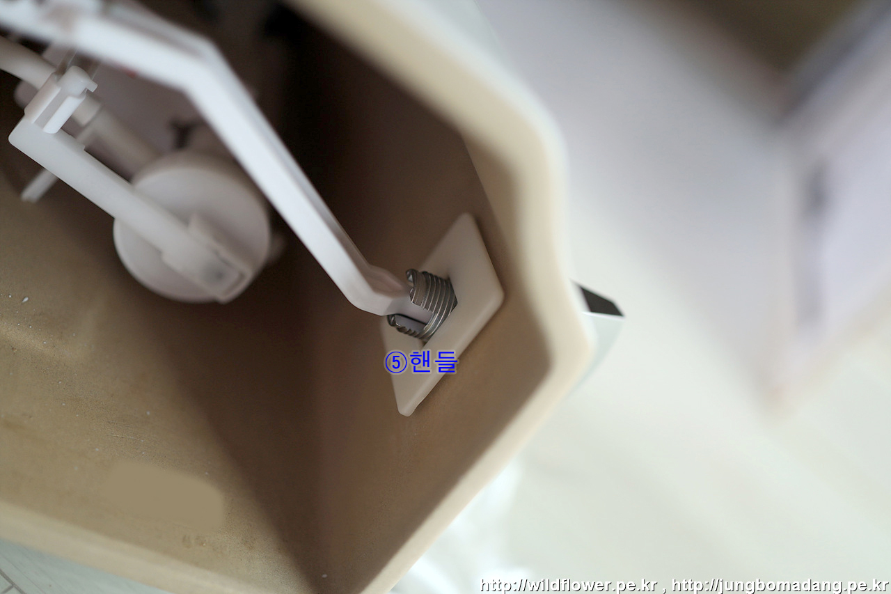 5. 핸들 설치 - 핸들의 홈이 물탱크 아래를 향하게 끼웁니다.