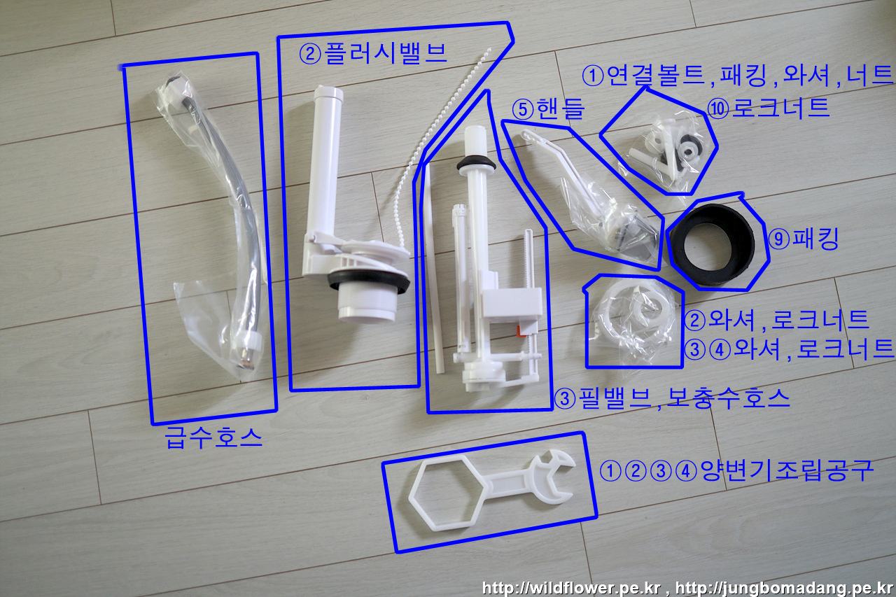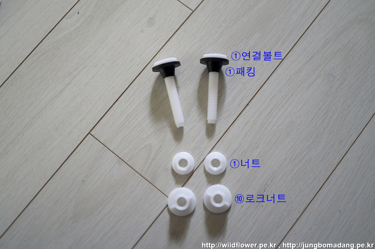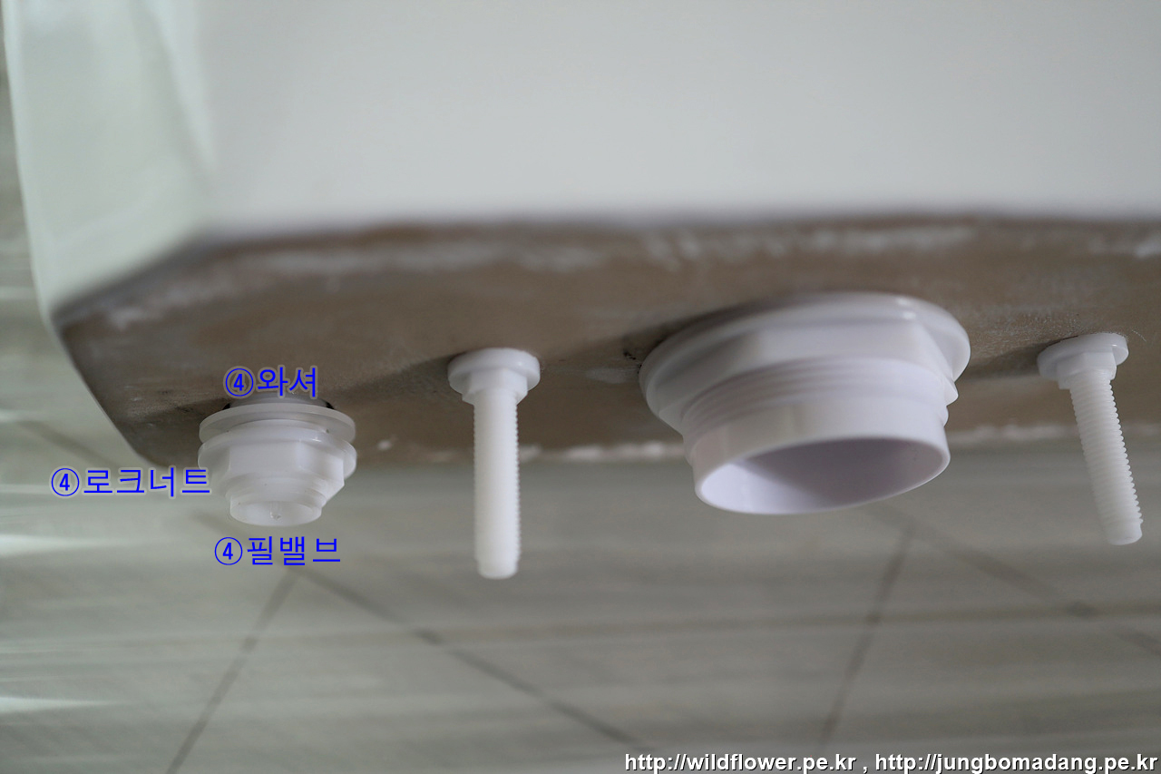 1. 탱크 세팅 - 연결볼트에 패킹을 끼우고 물탱크에 끼운 뒤 너트를 체결하고 마지막으로 로크너트는 9.번 과정에서 체결합니다.