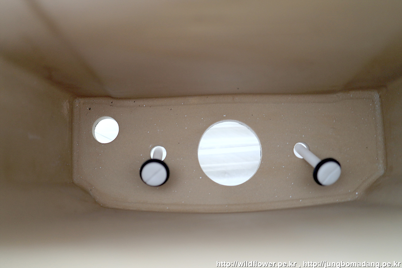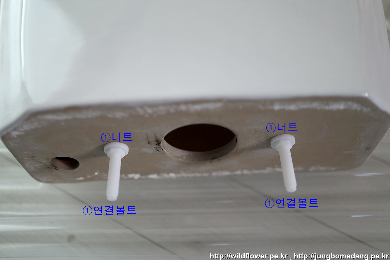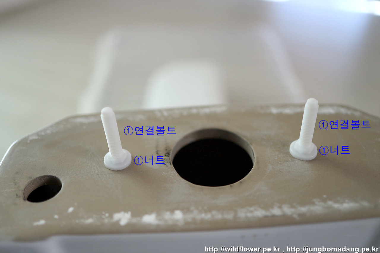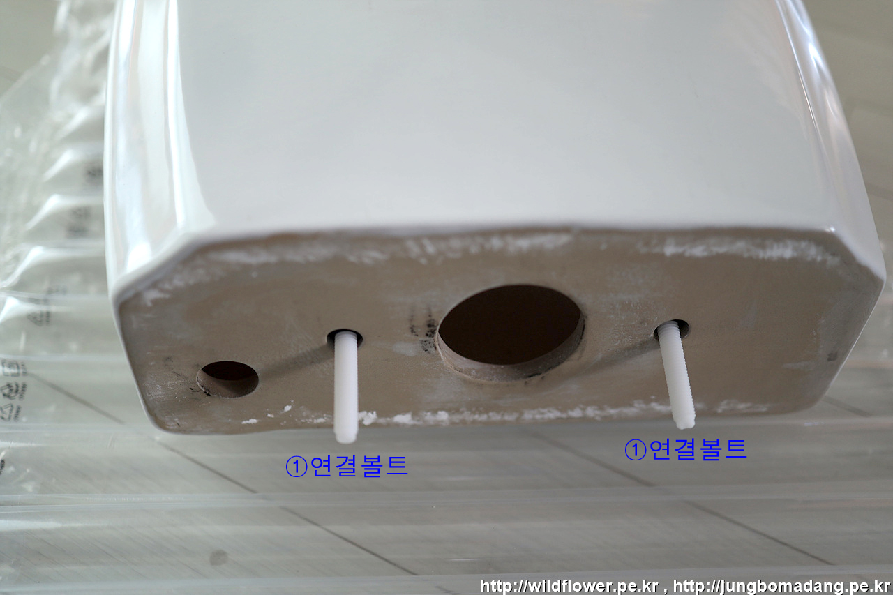 1. 탱크 세팅 - 연결볼트를 물탱크 안쪽에서 구멍으로 뺴냅니다.