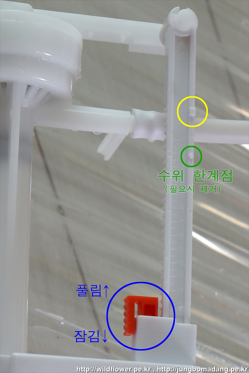 3. 필밸브 설치 - 물탱크에 조립 전에 만일 수위가 낮아서 물내리는 것이 원활치 않다면 스토퍼를 풀고 아래로 내리면 초록색 수위 한계점 돌기가 보이는 데 제거하면 좀 더 많은 물을 채워서 내릴 수 있습니다. 수위 조절을 마쳤다면 스토퍼를 닫습니다. 만일 불필요하다면 본 과정은 넘어갑니다.