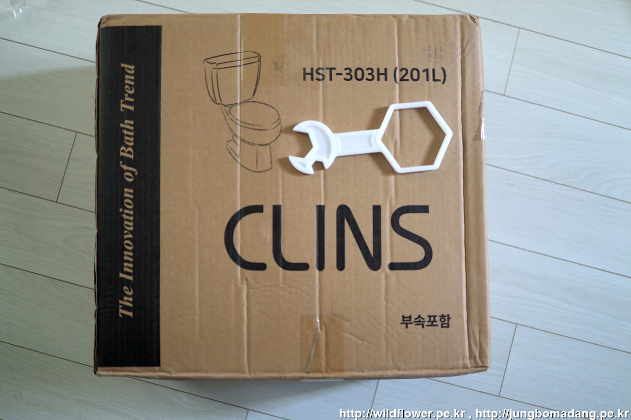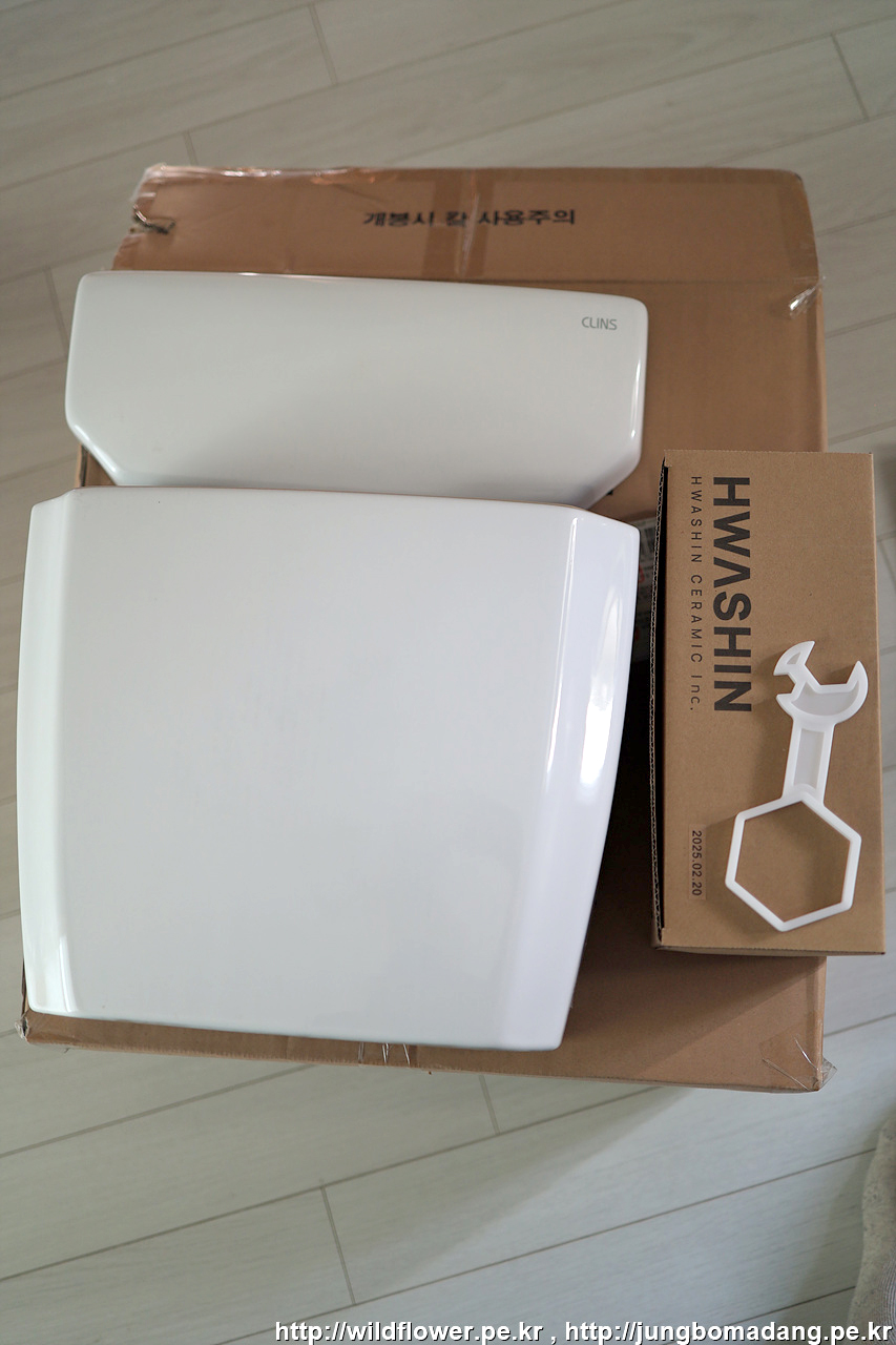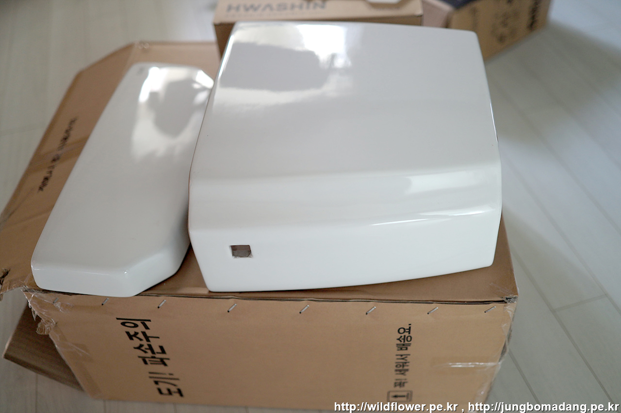 언박싱을 합니다. 좌측은 물탱크 본체와 뚜껑, 우측에 부속품 박스와 설치 공구(흰색)입니다.