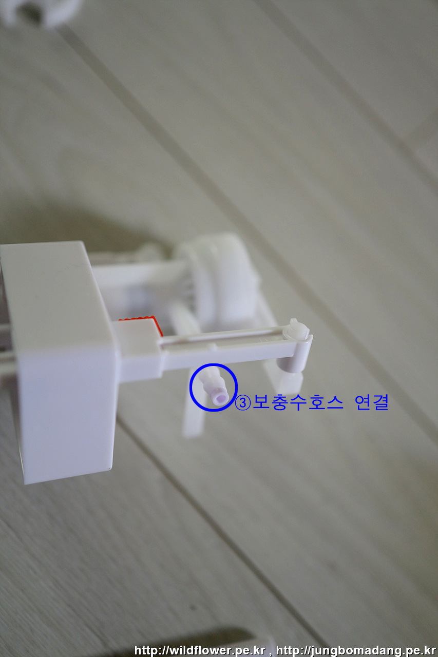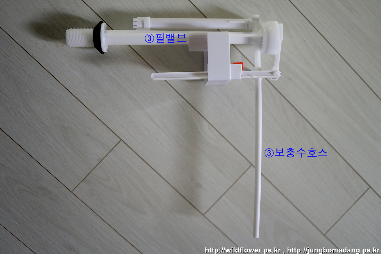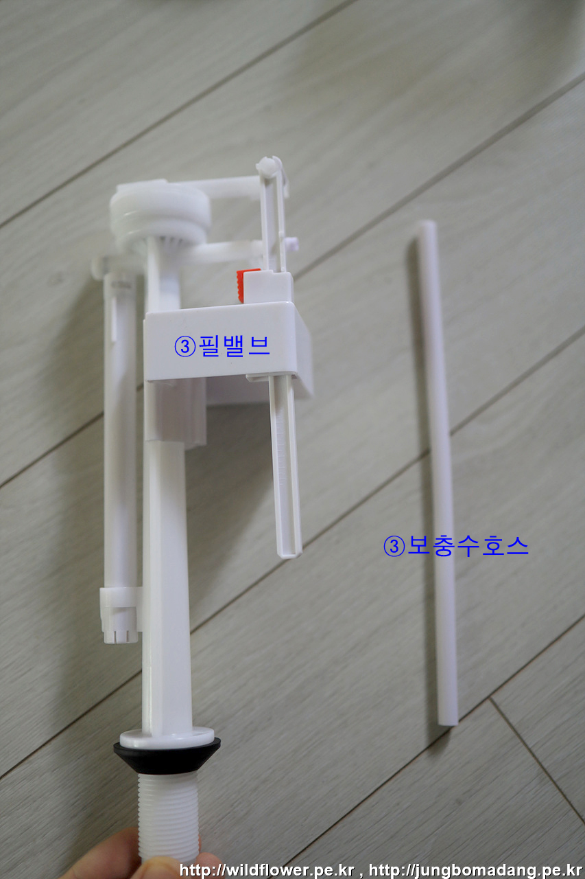 3. 필밸브 설치 - 필밸브에 보충수호스를 끼우고 물탱크에 조립합니다.