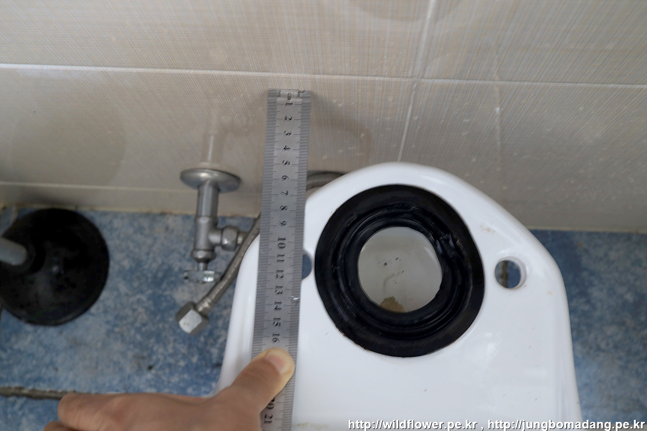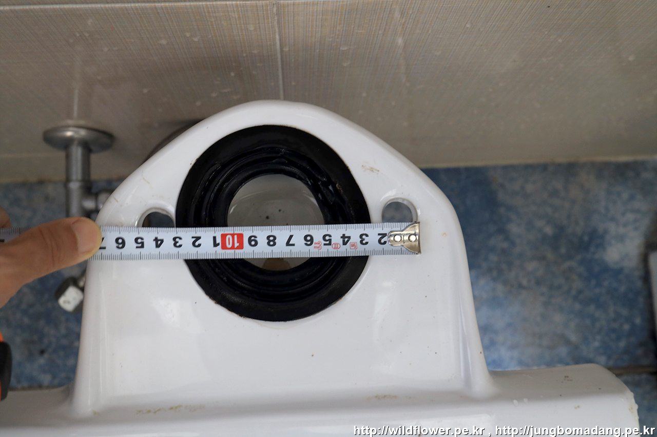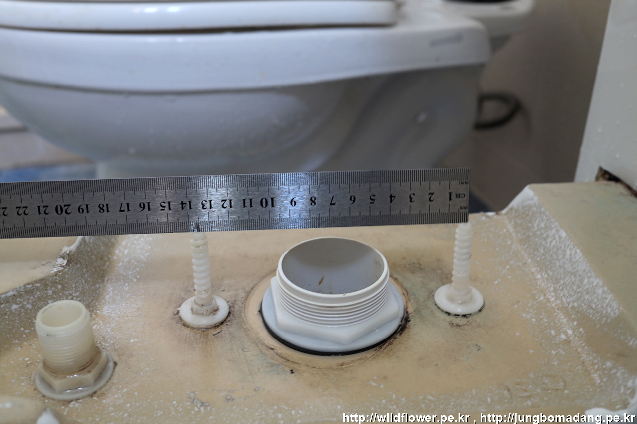 물탱크를 교체하려면 중요한 것이 기존의 연결 볼트간의 간격과 벽면과의 거리등을 확인하여야 합니다. 연결 볼트간의 간격은 기존 간격을 보니 135mm로 교체할 제품인 크린스 303H는 140mm 이상으로 확인되어