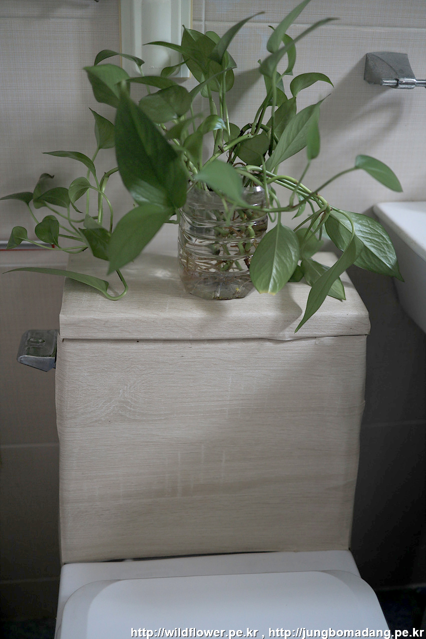 기존에 새는 물탱크입니다. 실리콘으로 때운 것 꼴보기 싫어서 시트지 발라 뒀습니다.