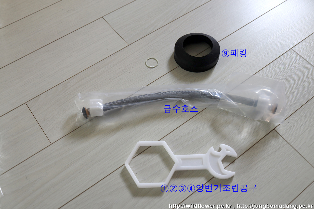 1. 탱크 세팅 - 연결볼트에 패킹을 끼우고 물탱크에 끼운 뒤 너트를 체결하고 마지막으로 로크너트는 9.번 과정에서 체결합니다.