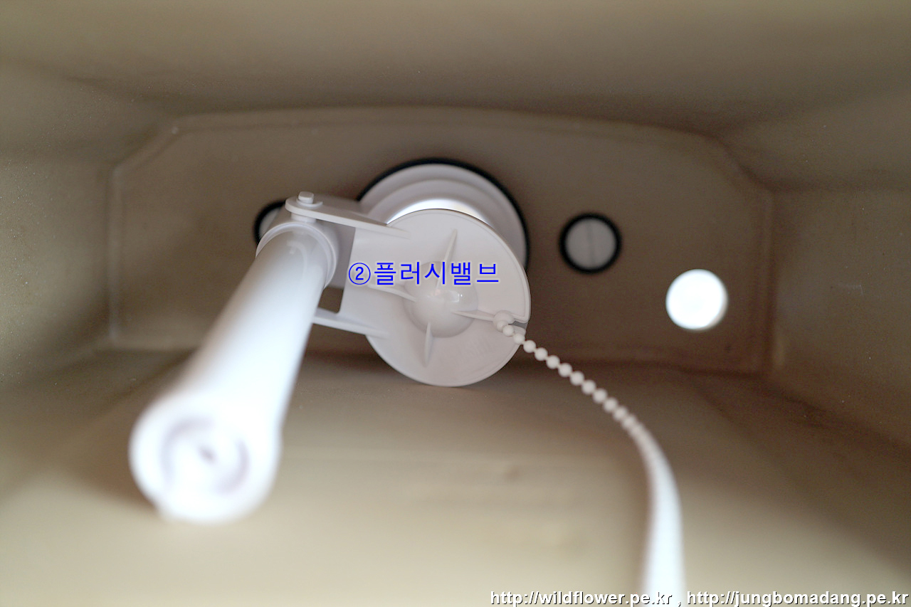 2. 플러시밸브 설치 - 물탱크 안쪽에서 구멍에 끼웁니다. 방향 주의합니다.