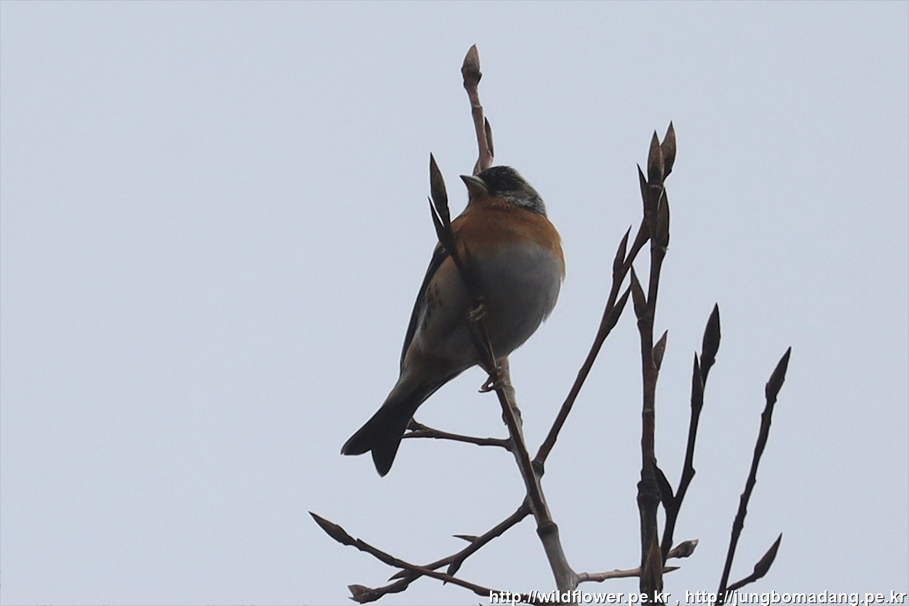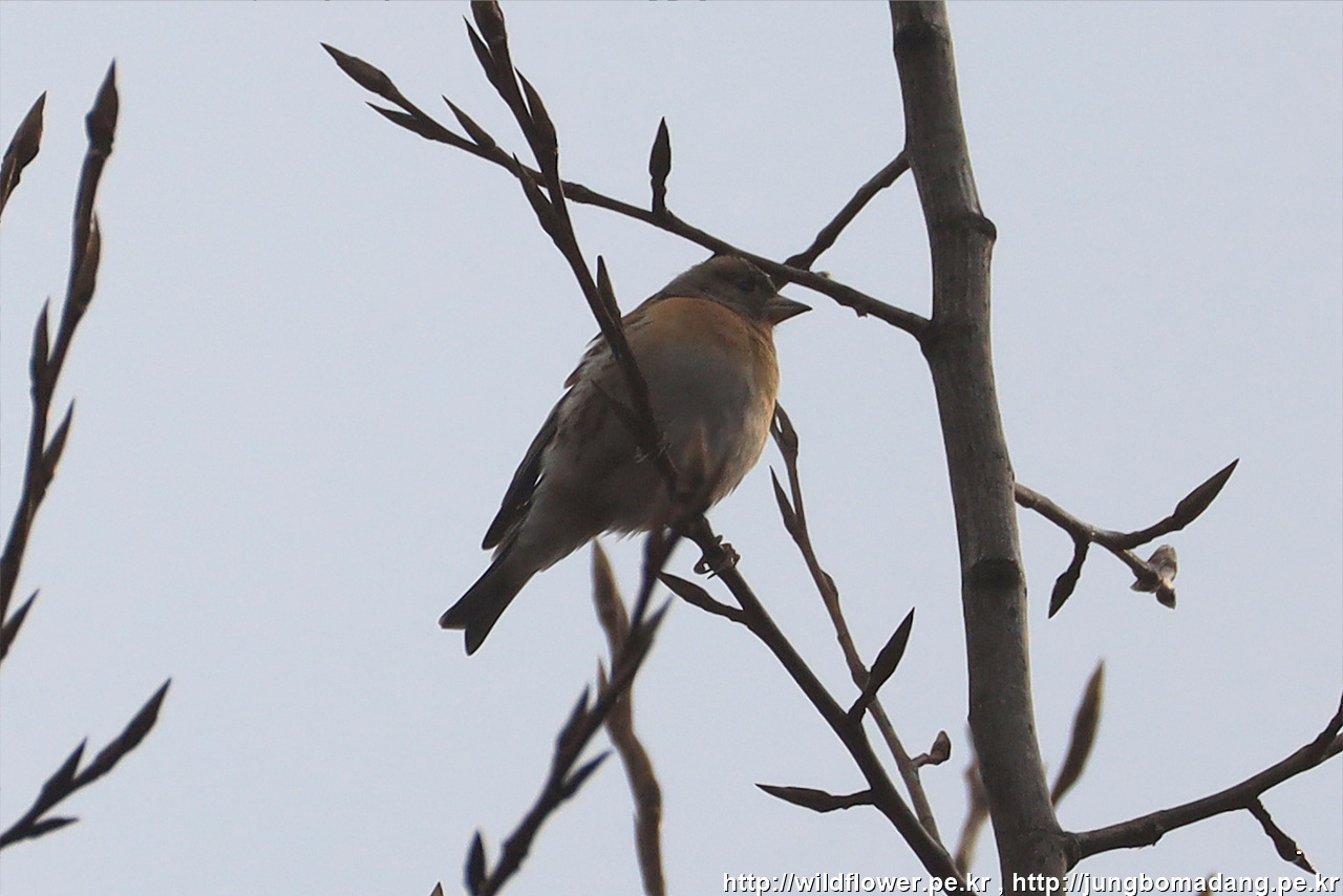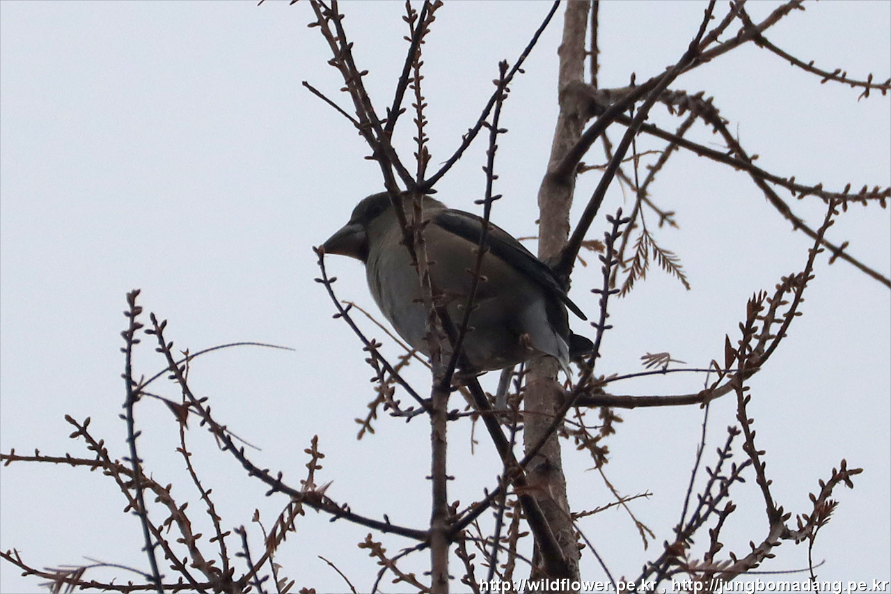 되새 - 수컷 겨울깃. 크롭 사진입니다. 멀찌감치 나무 꼭대기에 안무데기가 왔다가 잠시 후 사라집니다.