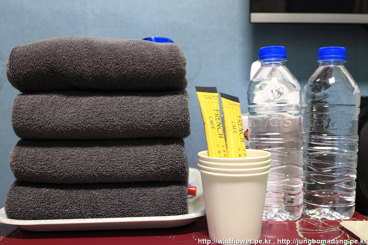 1인실에 머무는 데 수건 4장에 물 2개가 비치되어 있네요. 여행하다 보면 1인실에는 야박하게 수건 2장에 물 1개 비치된 숙소도 있는 데 이 부분이 맘에 드네요. 게다가 커피믹스는 덤이죠.