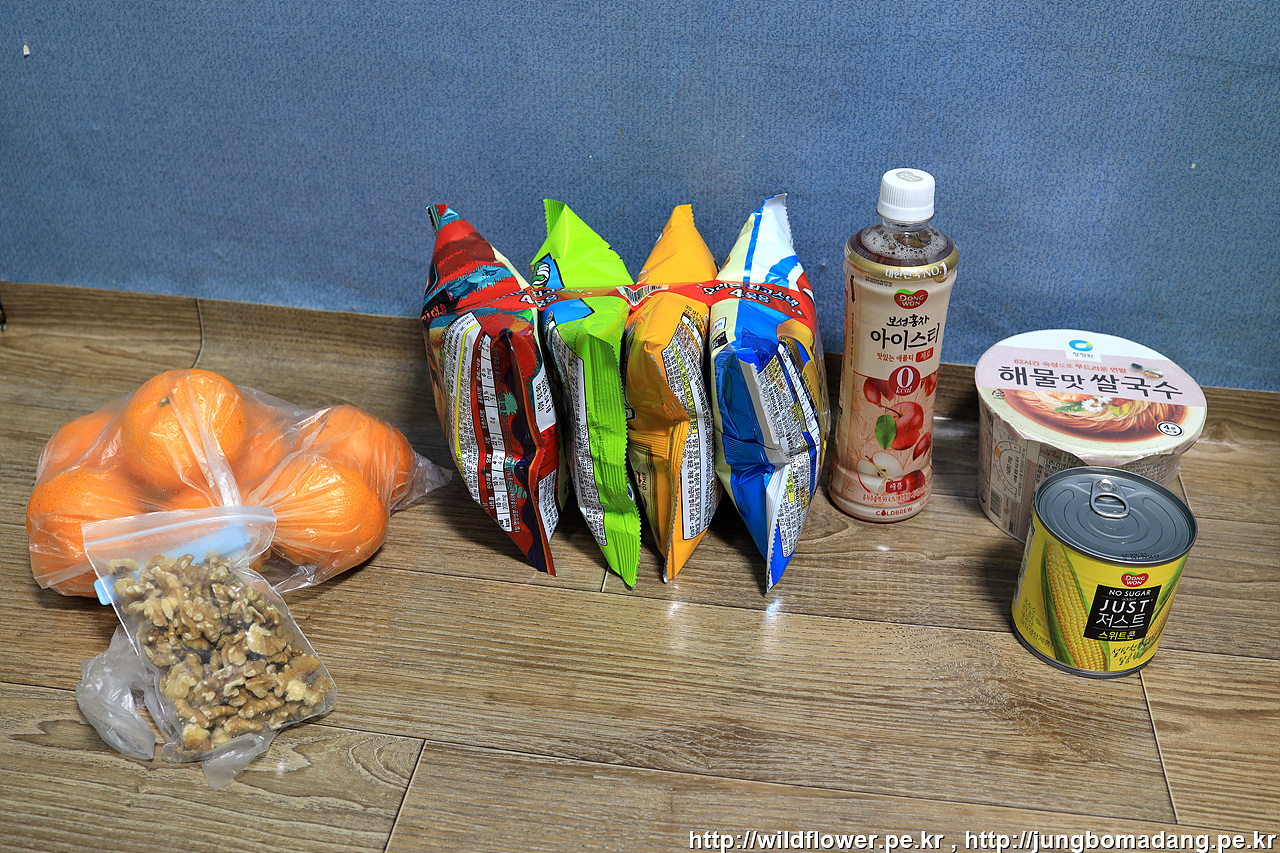 배 두둘기면서 하나로마트를 경유해서 숙소에 도착합니다. 숙소는 강릉오면 머물게 되는 금성모텔입니다. 귤은 집에서 챙겨왔고, 과자와 아이스티는 저녁에 입가심하고, 쌀국수와 스위트콘은 다음날 아침 경포 탐조 전 먹을 예정입니다.